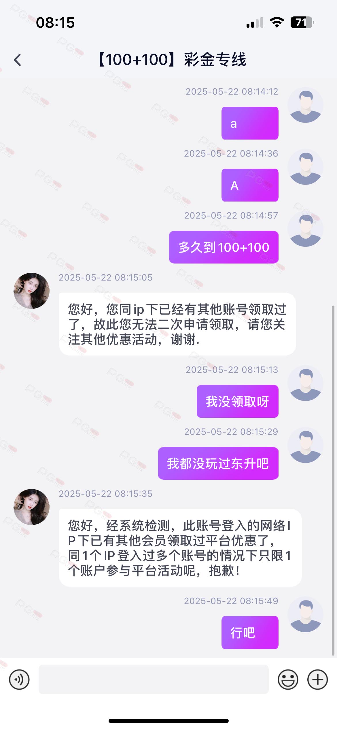 撸成功的老哥,请跟客服说您是从PG论坛 【PG.Biz】过来的。