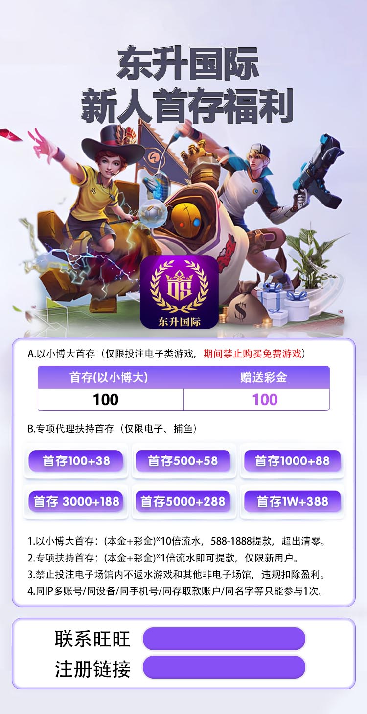 首存活动只能参加一个,参加100+100其他首存活动都无法参与,本活动仅限独立账户参与,如同姓名、同一手机号、同一IP、同一银行卡账户多账号均不参与,参加此活动禁止转分,代充,藏分,刷水等,如有发现没收一切金币,该活动需要在未下注联系在线客服申请