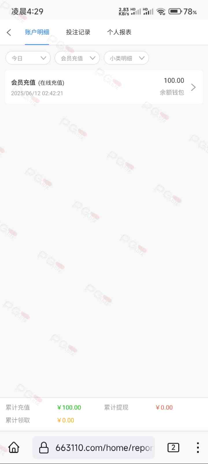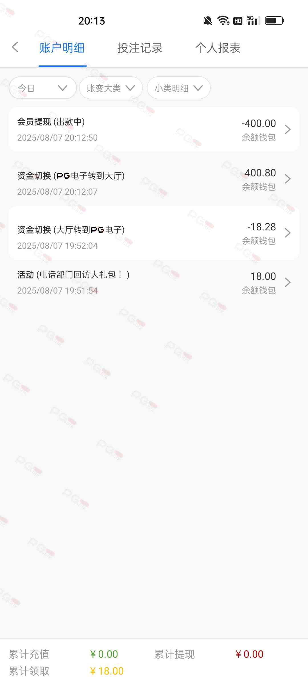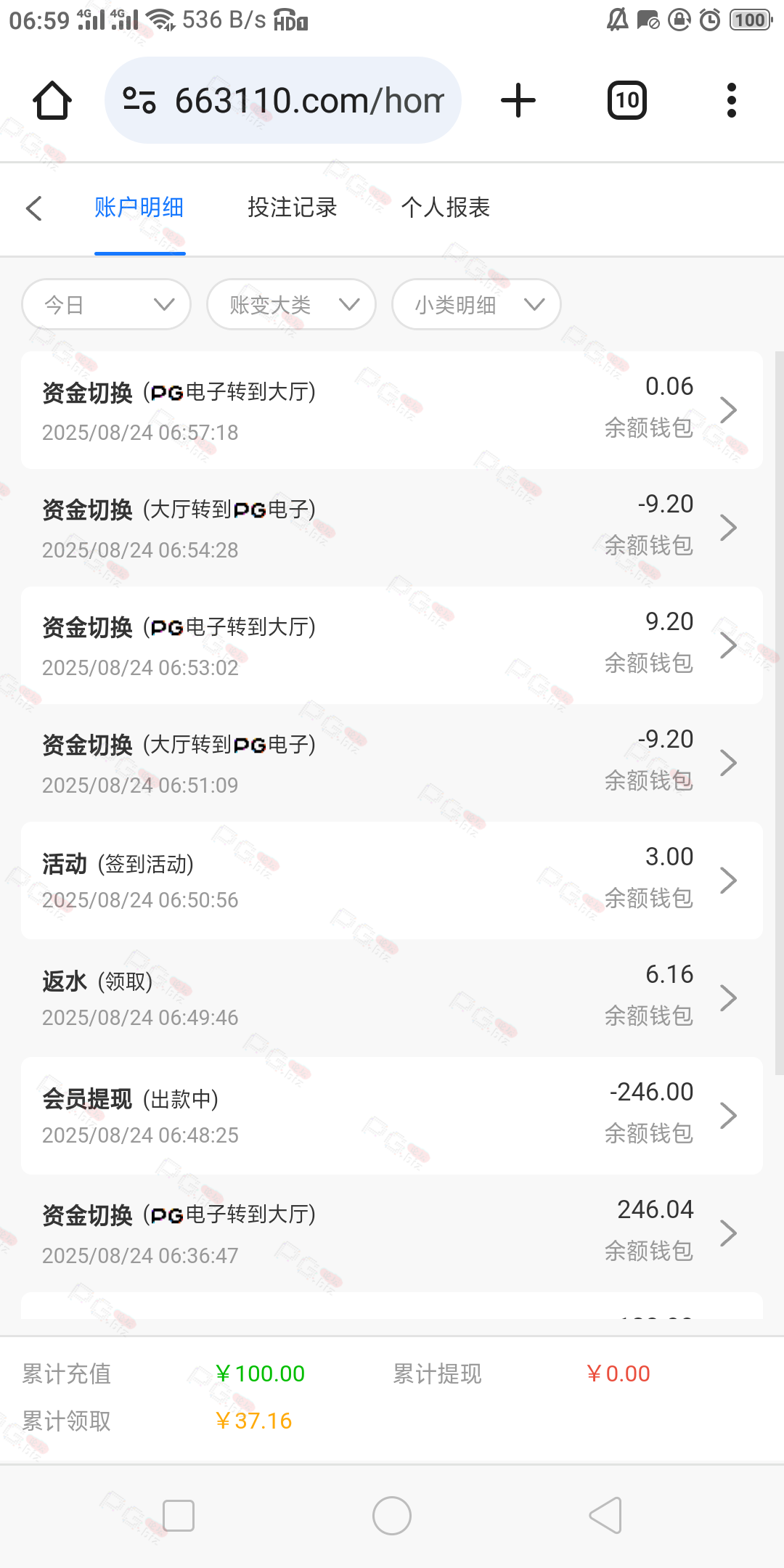 充100,打一晚上,基本的pg的游戏都玩了个遍,一直在买夺宝,输完了领的28也输完了,最后仅靠点反水打1.8麻将成功提两百,进两次1.8麻将加起来不到50块,不玩了不玩了,确实老哥们说到不错,没有水,唯一的好处就是不黑吧,提现挺快的,app彩金也可以给我申请