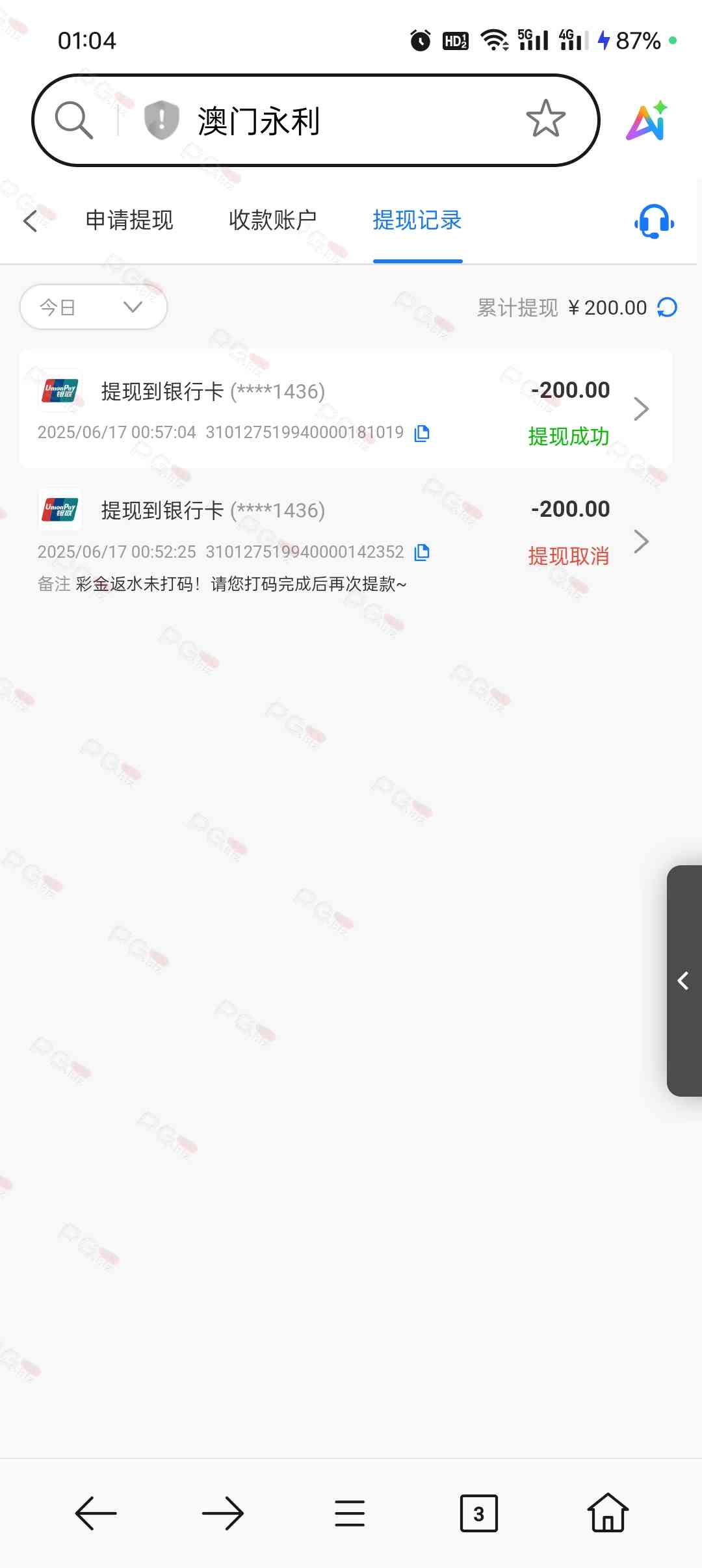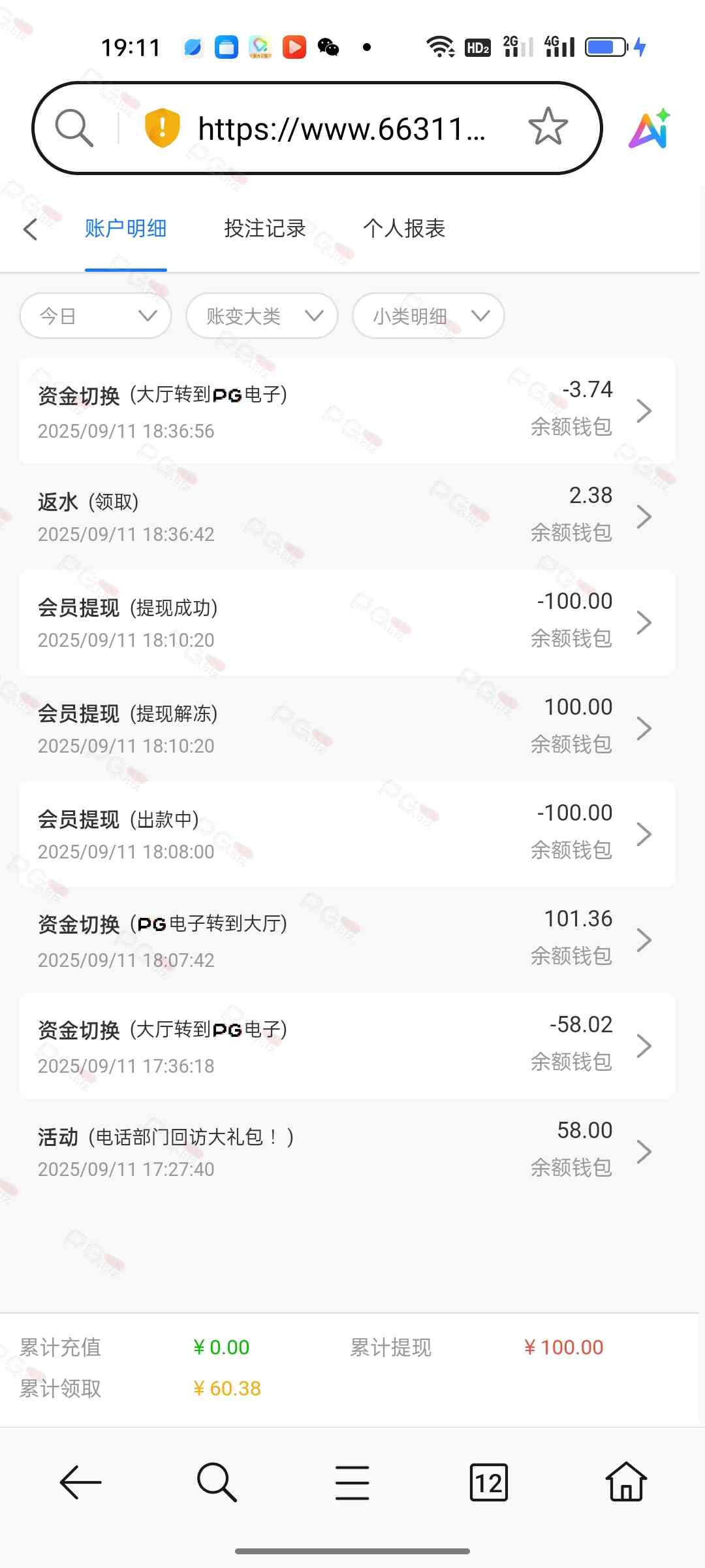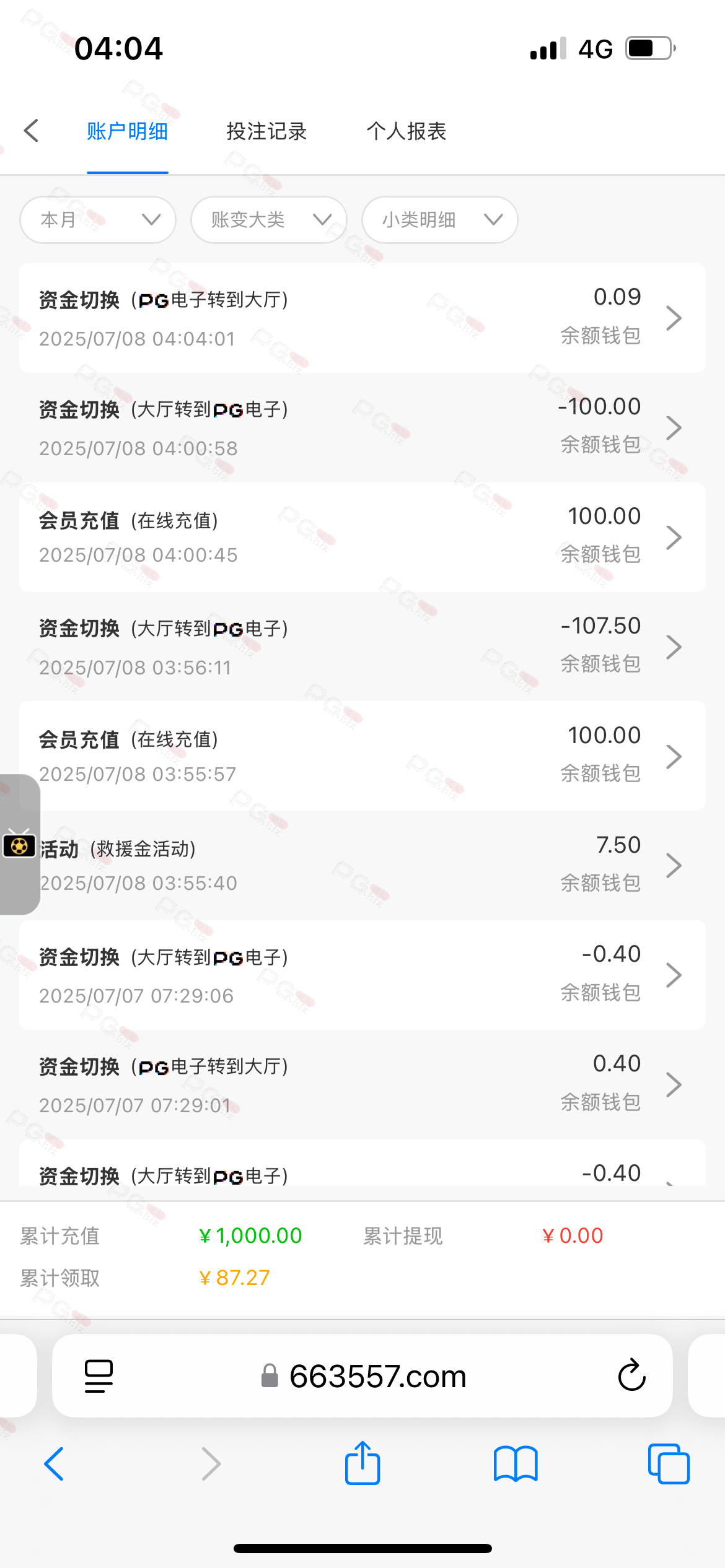 充100,打一晚上,基本的pg的游戏都玩了个遍,一直在买夺宝,输完了领的28也输完了,最后仅靠点反水打1.8麻将成功提两百,进两次1.8麻将加起来不到50块,不玩了不玩了,确实老哥们说到不错,没有水,唯一的好处就是不黑吧,提现挺快的,app彩金也可以给我申请