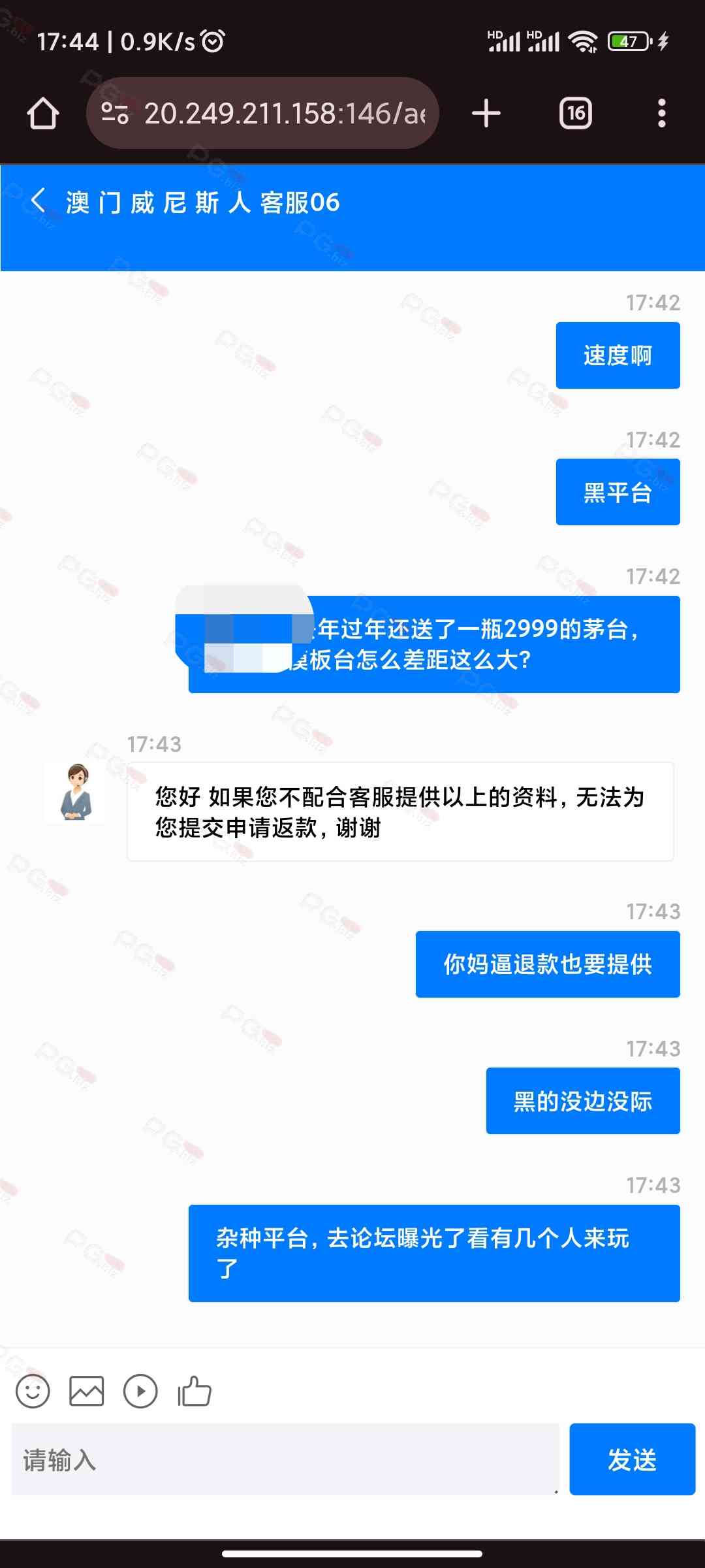 曝光黑平台146威尼斯人黑平台!平台写的注册送28彩金打上280,然后十倍流水提!输了,再然后下载送48彩金打上480,也是十倍流水提输了!再然后反水打上250不给出款说流水没打够继续打输了剩150从早上提款一直不给出说洗码不同步,然后又等到中午提款一直到现在直接让提供身份证照片手持身份证!还要你最近两笔的交易记录!黑逼平台(提供身份证,手持身份证)你们要玩就去!