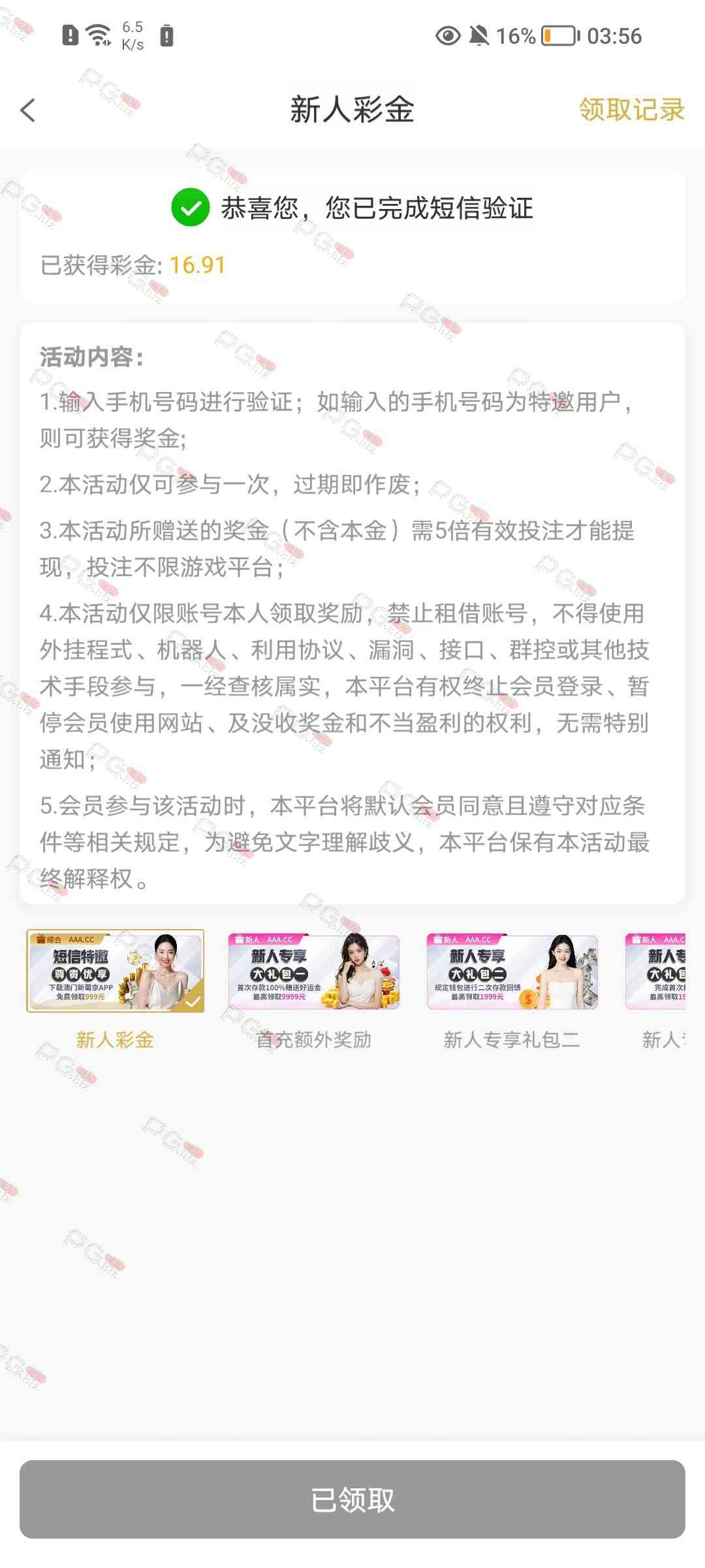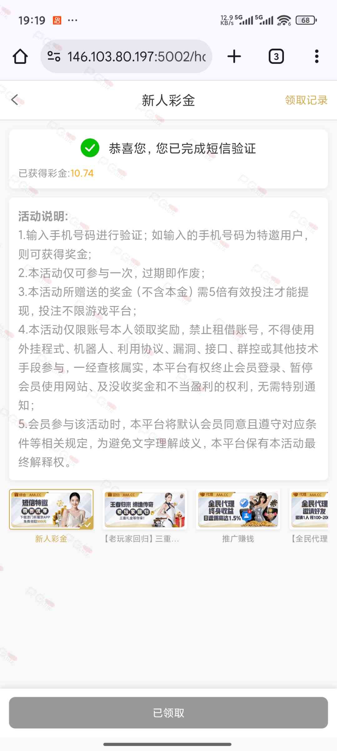 短信验证送彩金,先试试是不是特邀,提现需要下载app 只能钱包。