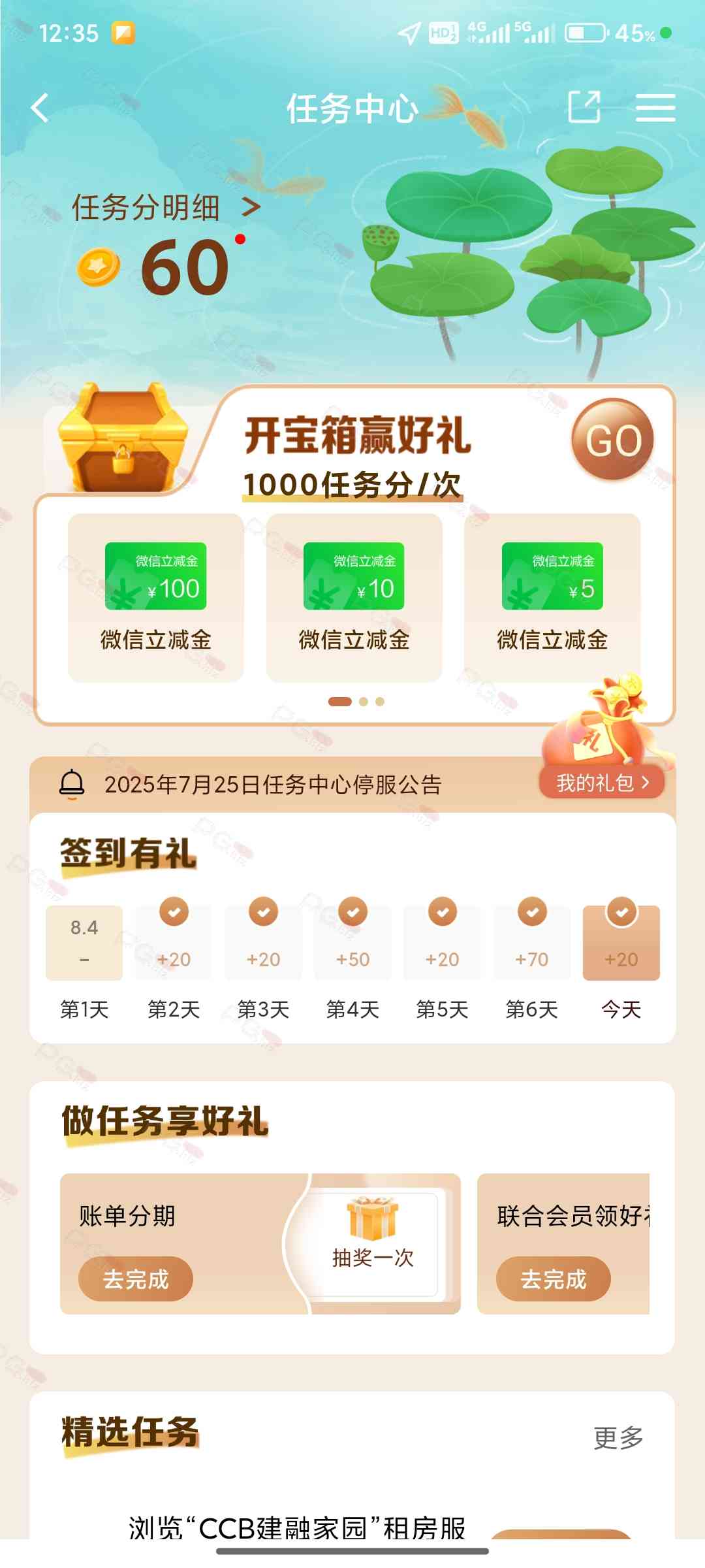 建设银行搜索任务中心,做任务领积分抽奖,说不定就中100立减金了,也有可能毛都没有