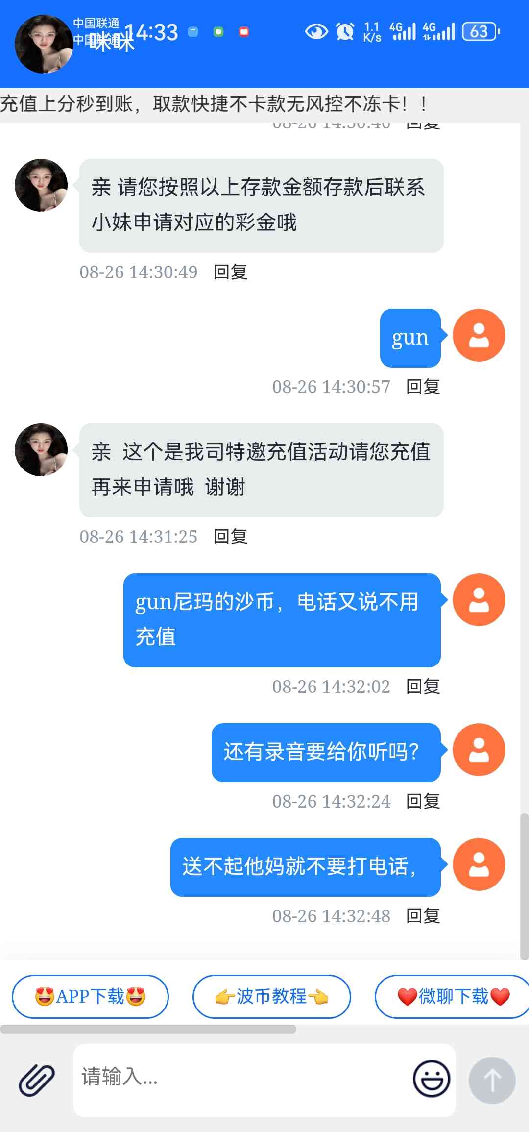 正午休接到电话说免费领取188彩金,把我高兴的,一下就清醒了,叫我注册好完善信息找在线客服申请,尼玛要我充值,问候了他们祖宗十八代,然后把我号封了