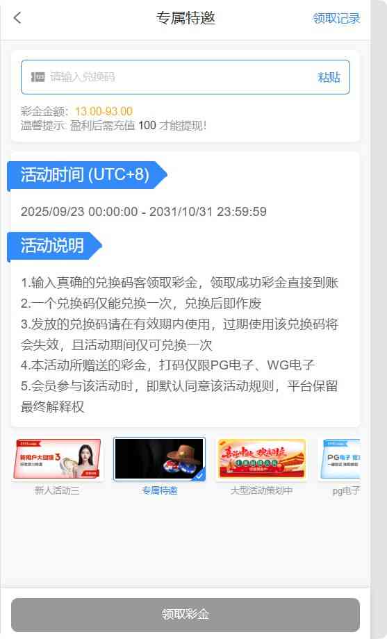 彩金代码仅限新用户领取,也就是当日注册的用户,领到彩金代码后到平台活动,专属特邀里面输入代码兑换,彩金代码是随机13-33金额