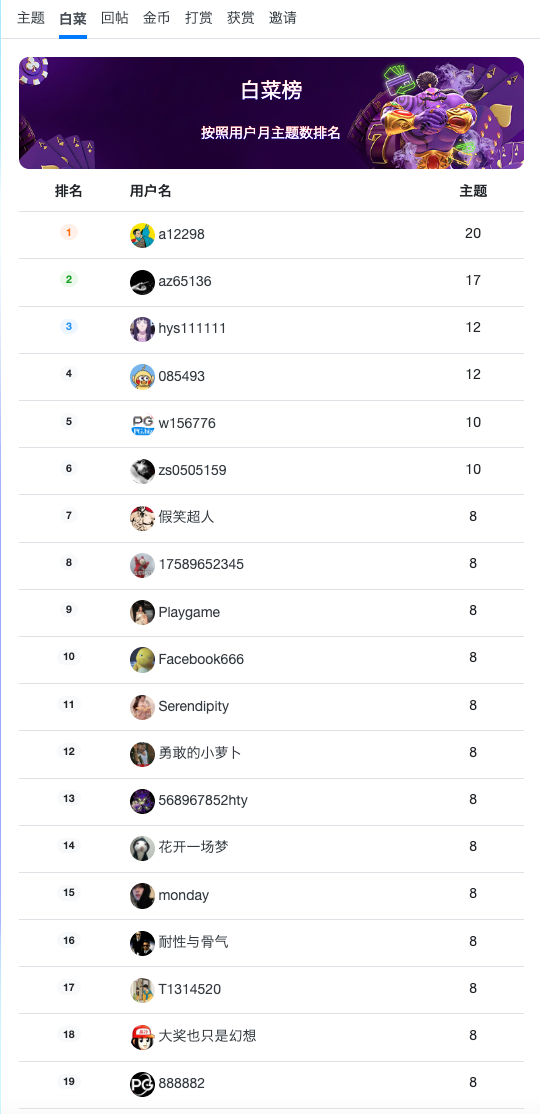 大家好,我是幸运星,由于论坛实在太大水了,导致很多幸运的老哥来PG论坛分享他们得吃的傲人战绩,但是基于基数实在太大了,导致现在论坛几乎都被得吃帖淹没了,幸运星怕这样失去了白菜论坛的本质,为此幸运星增加了每月白菜帖大神活跃榜,鼓励兄弟们多发白菜帖,让论坛能有更多更新的一手白菜资讯