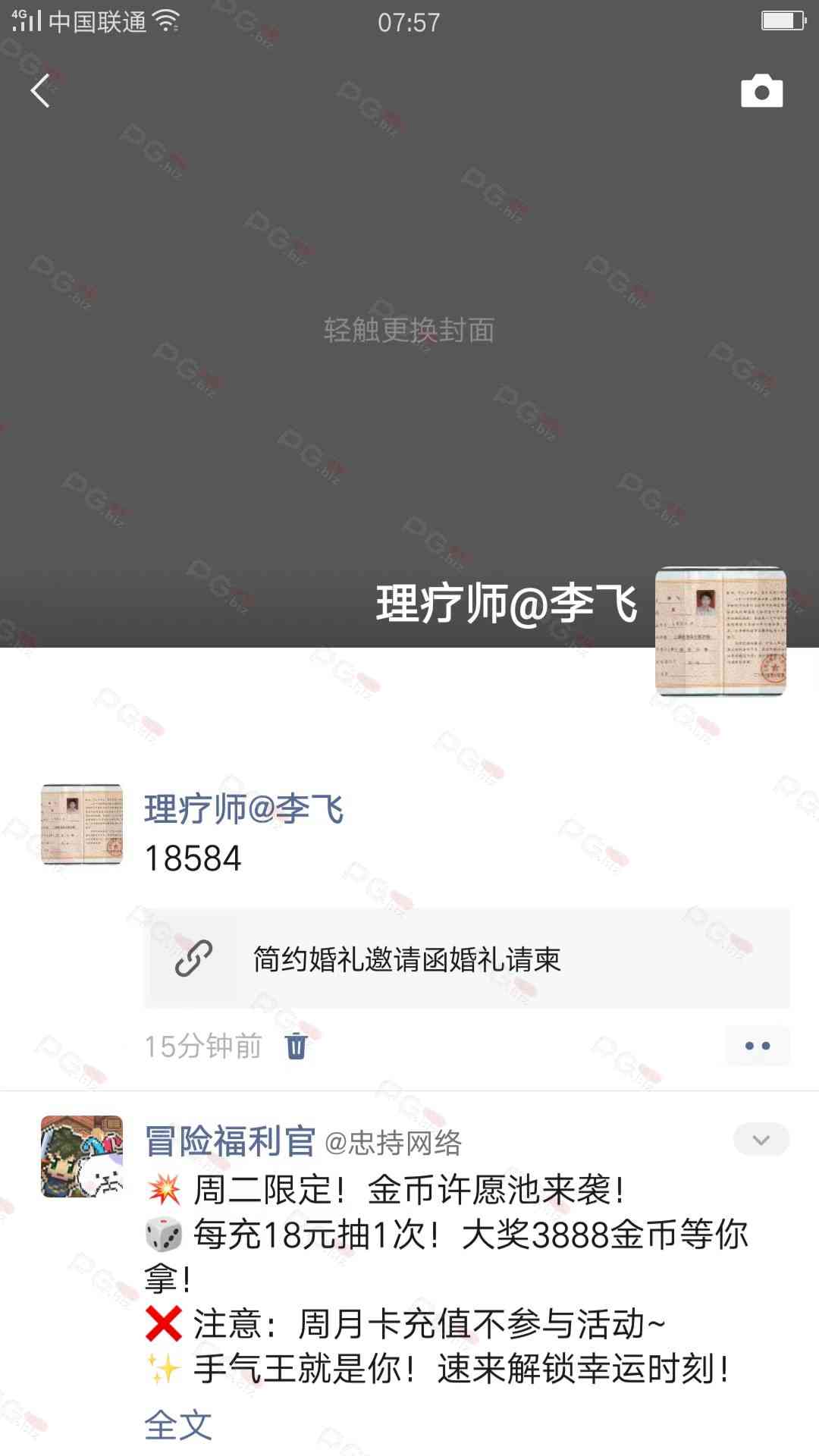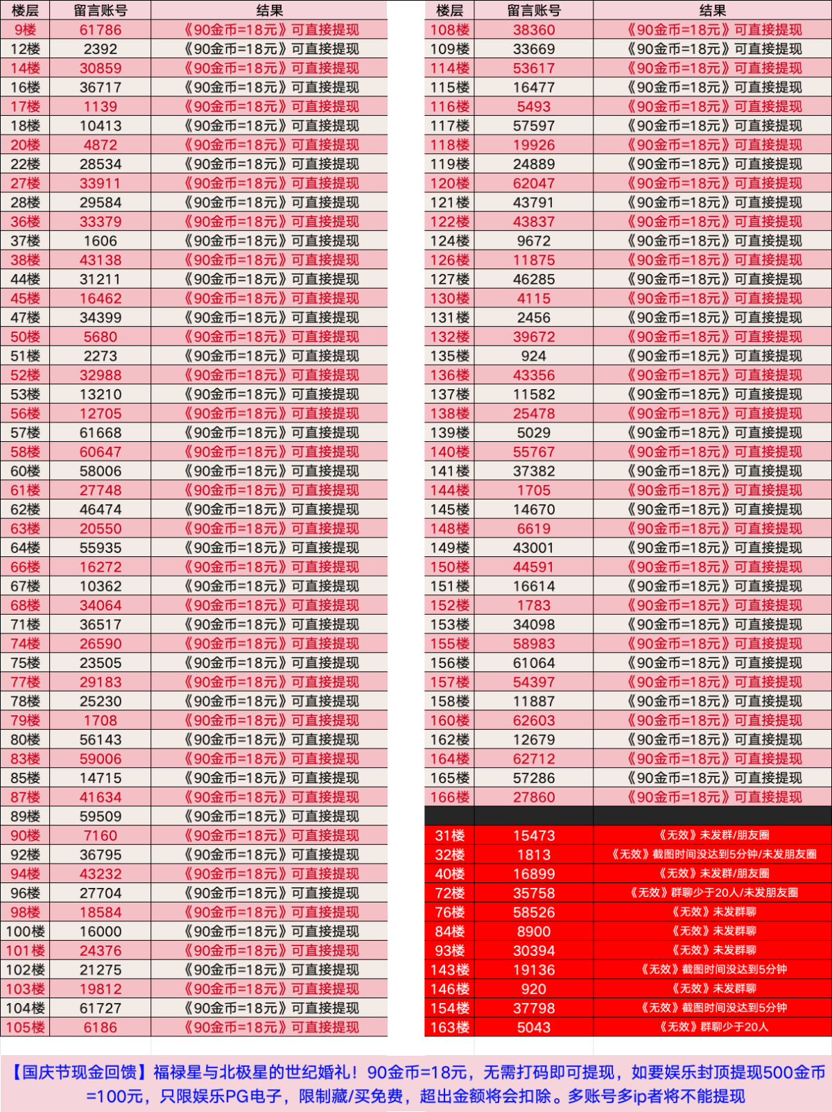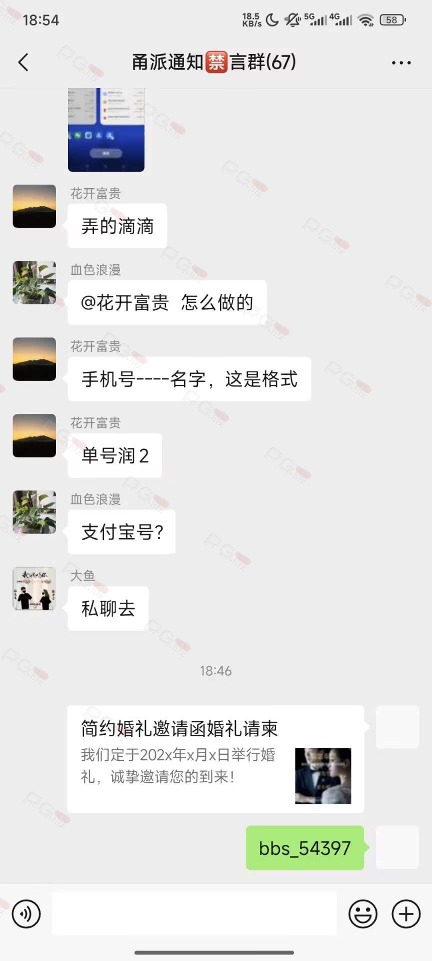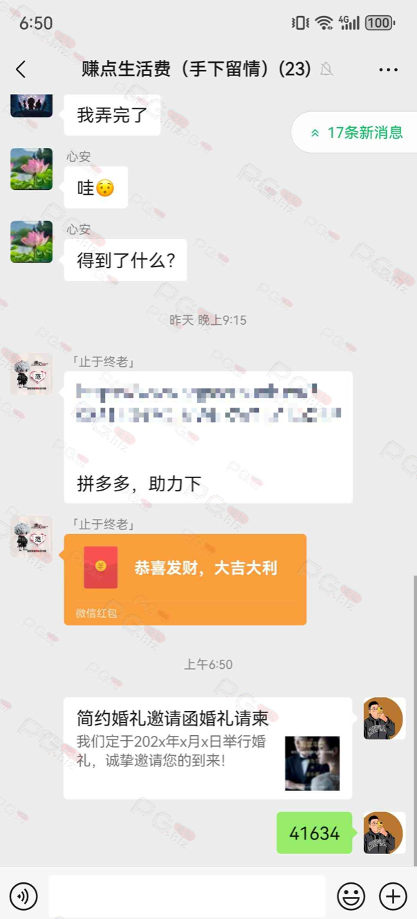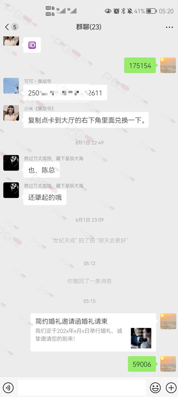 由于是国庆现金回馈的关系,幸运星要求的这些步骤其实不是很严格,不要求你们出示视频等证明,只是希望大家能开开心心的一起领个回礼,所以希望各位兄弟们也别造假,这些只是普通的婚礼邀请函,别搞假的或者搞了隐藏或撤回什么的,介绍多点新会员来,刚好能参与这场世纪婚礼,一起得到PG论坛的现金回馈18元回礼