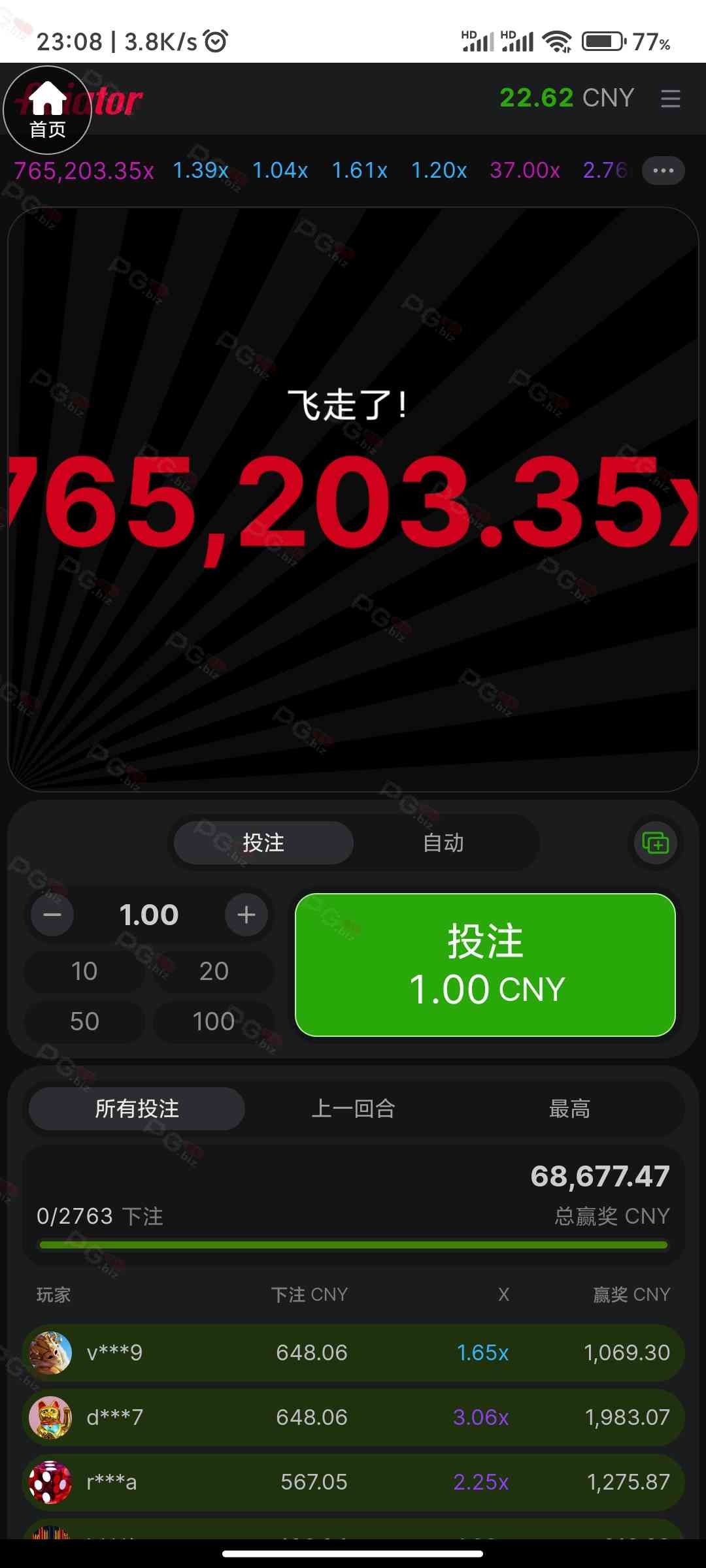 在1348平台白天抢了红包留在了晚上准备去飞行员搞搞,结果一进去就看到飞了一千多倍打底,我以为不会飞了,结果他喵的一直飞,有七十多万倍,我特么傻眼了!如果早一点进去就压上了,不说飞70万倍,飞个十万倍还是有可能的!真的是无语