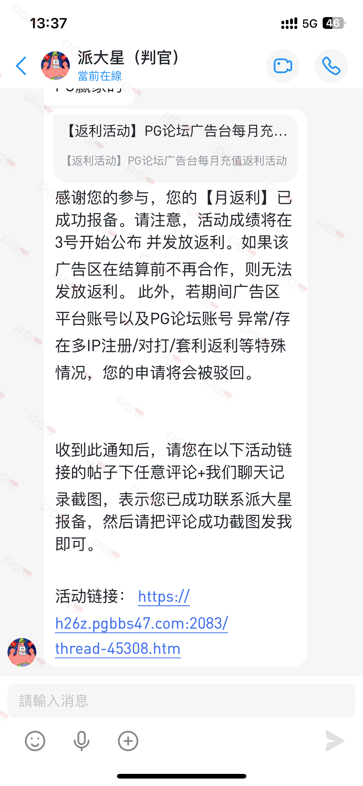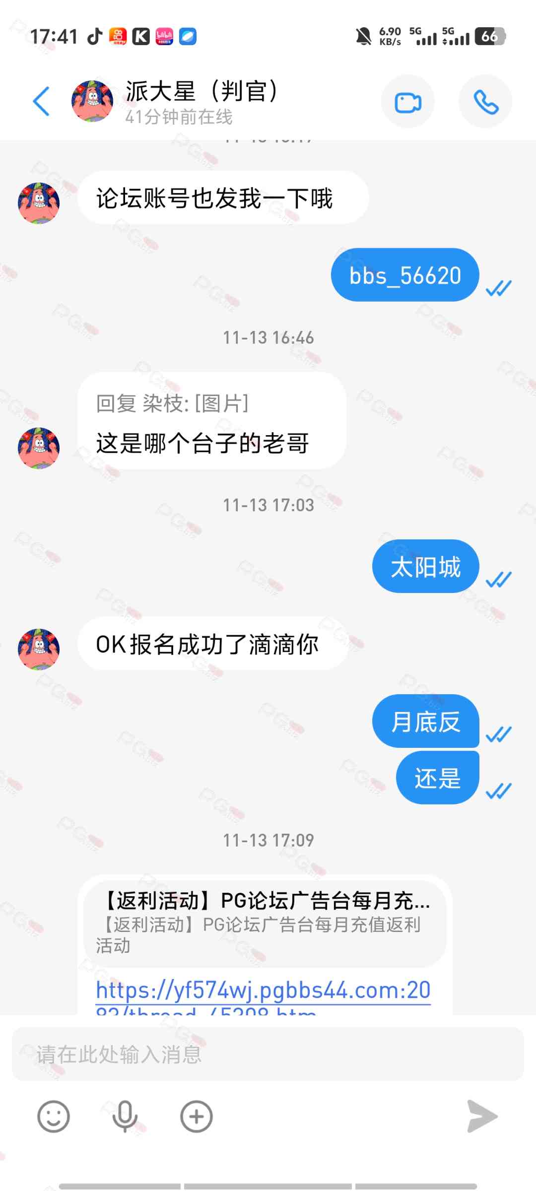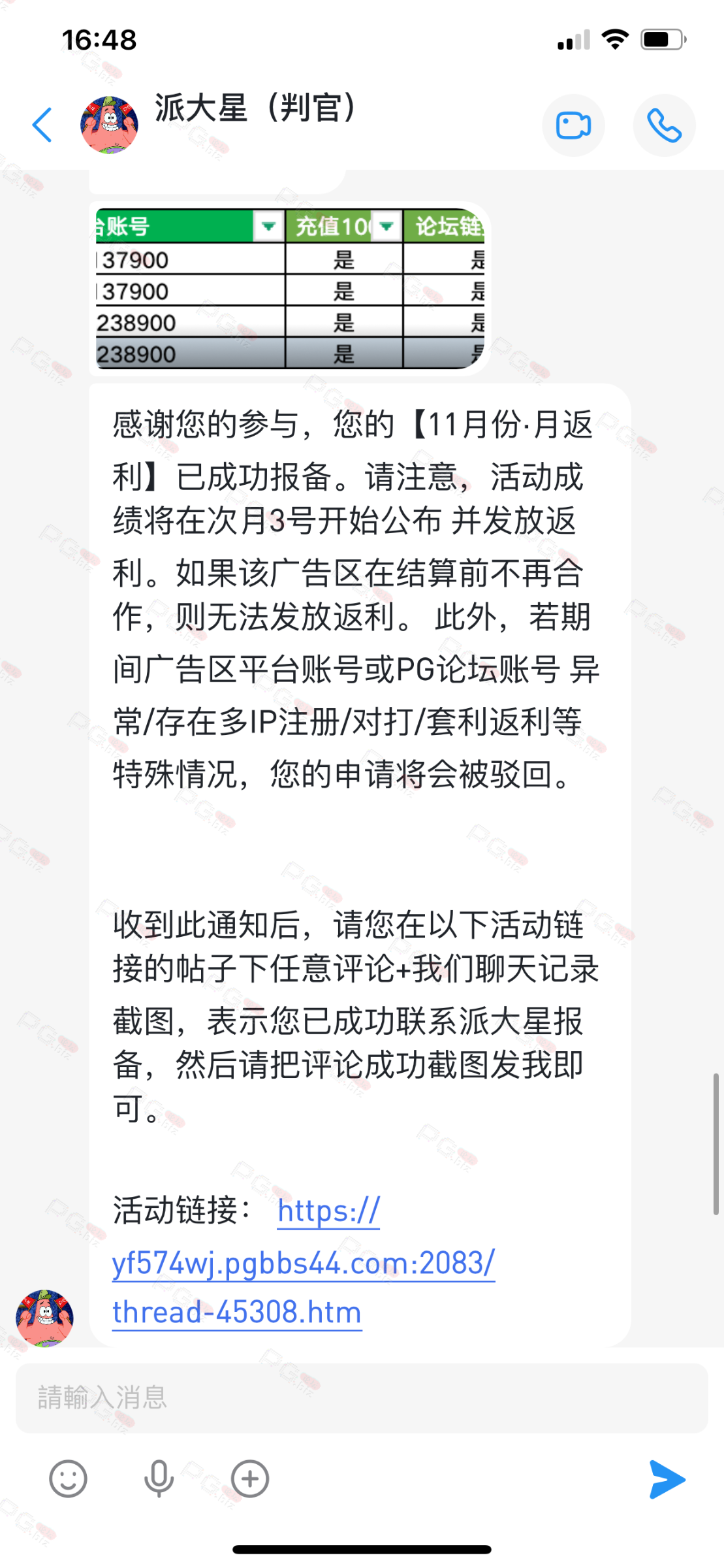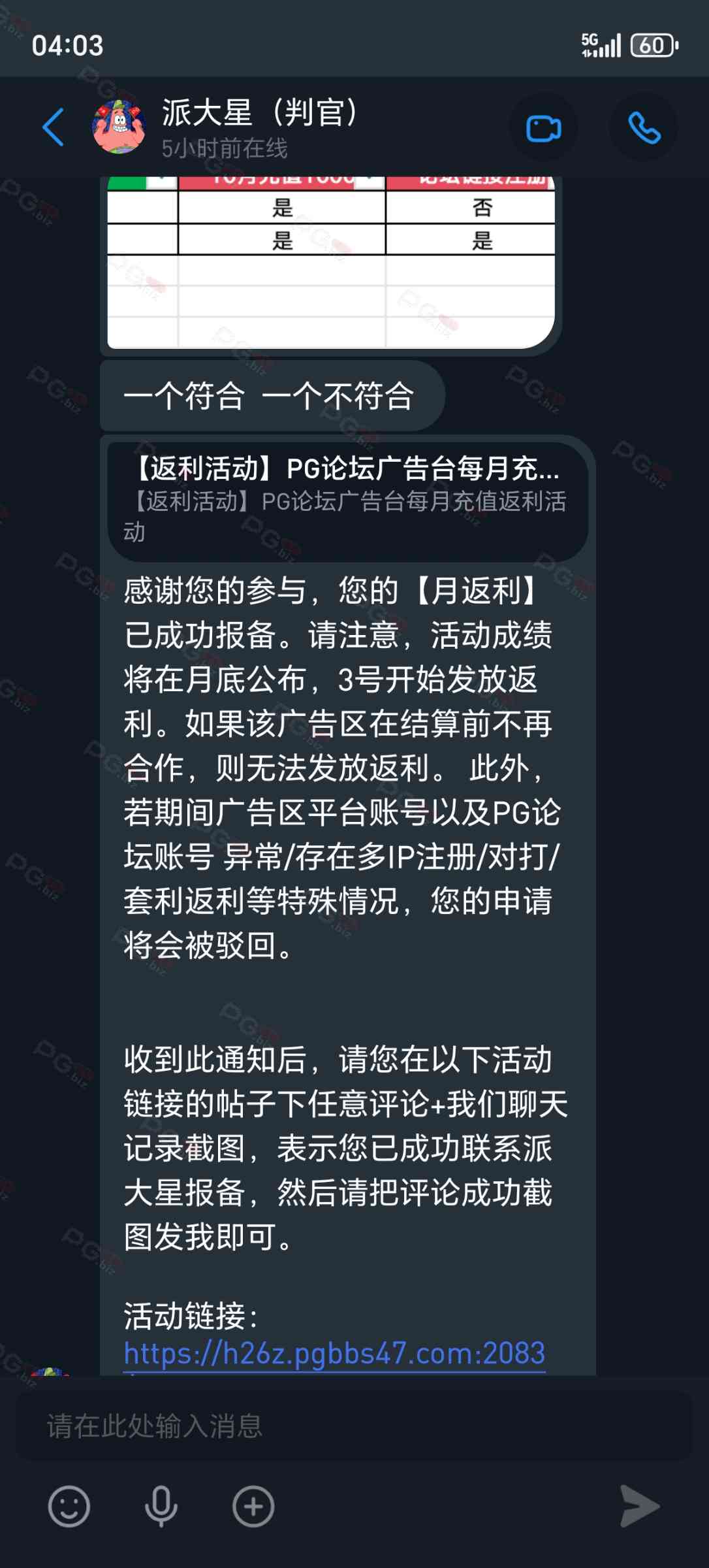 3.向派大星申请后,需要派大星跟狗庄确认是否走论坛链接,充值是否达标,核对后他会告知你是否成功报备,才算有效报备