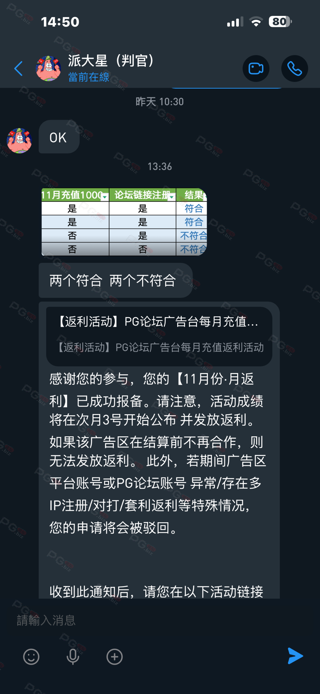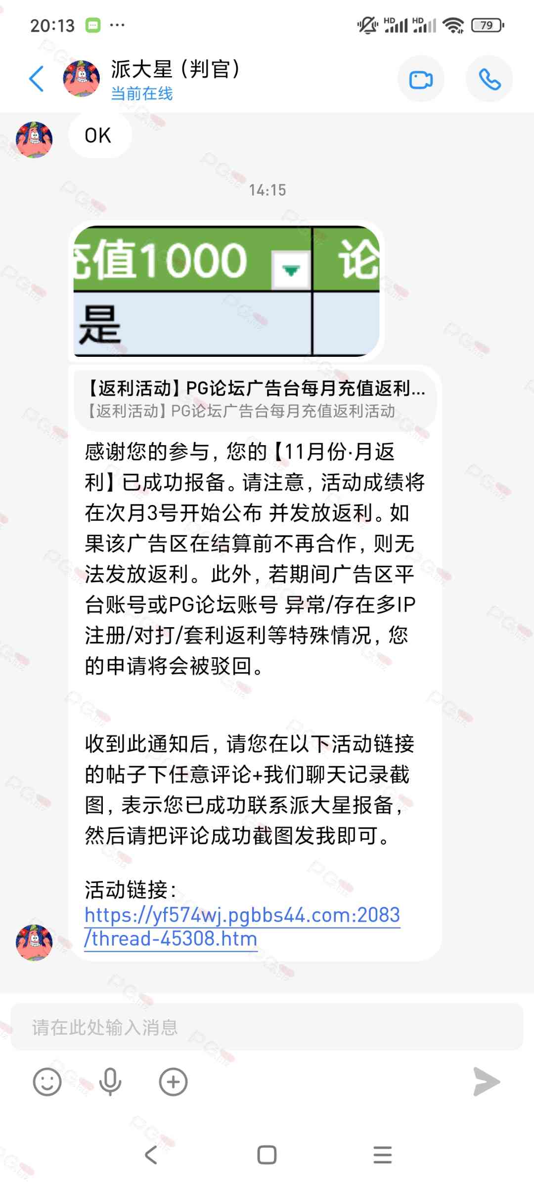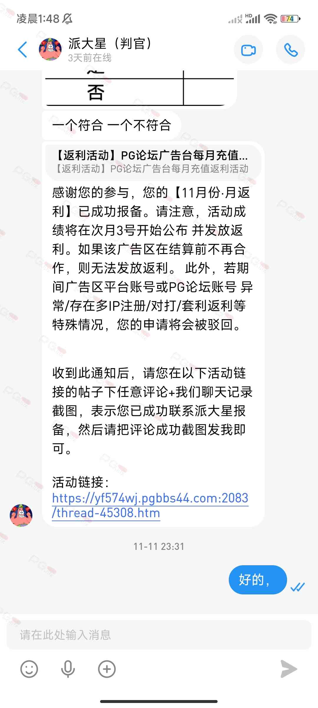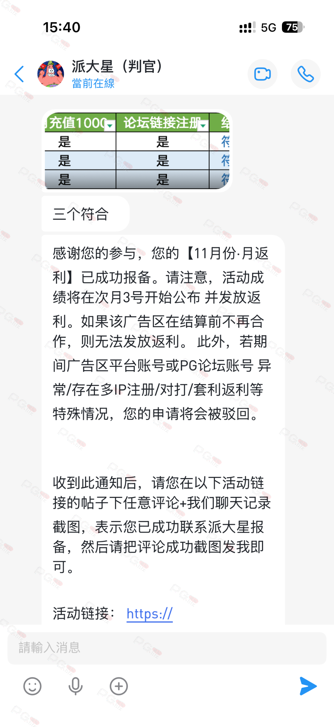 3.向派大星申请后,需要派大星跟狗庄确认是否走论坛链接,充值是否达标,核对后他会告知你是否成功报备,才算有效报备