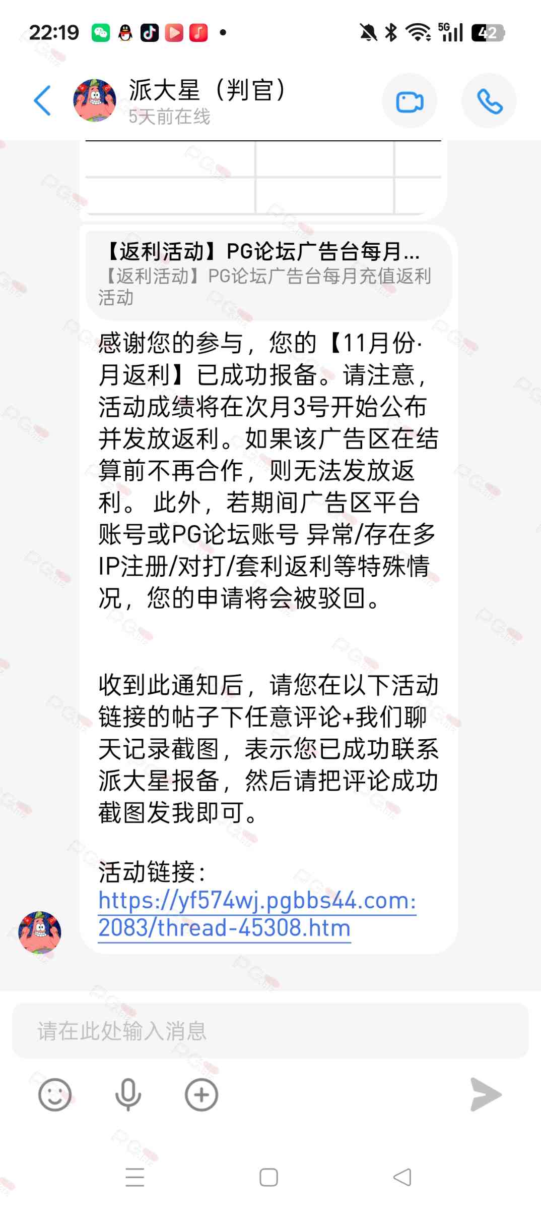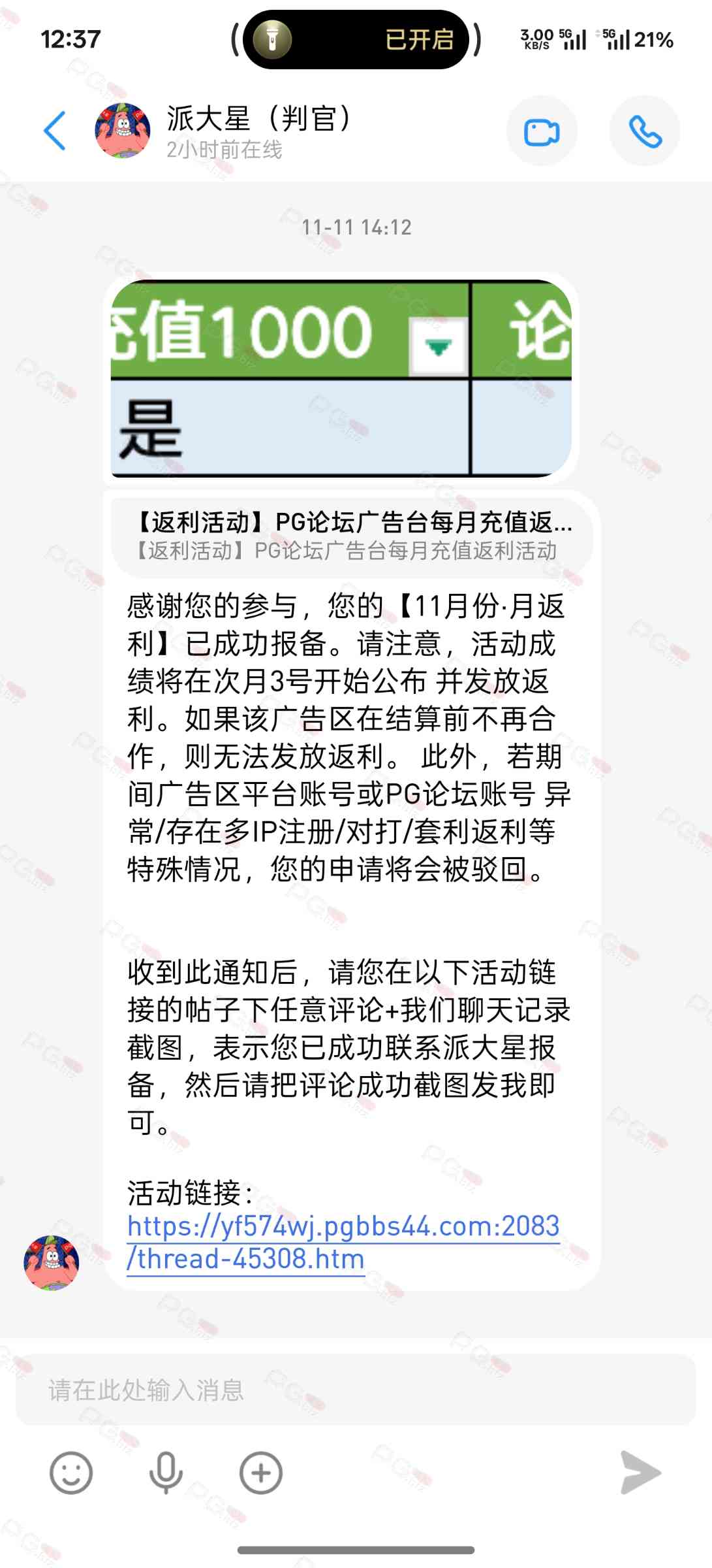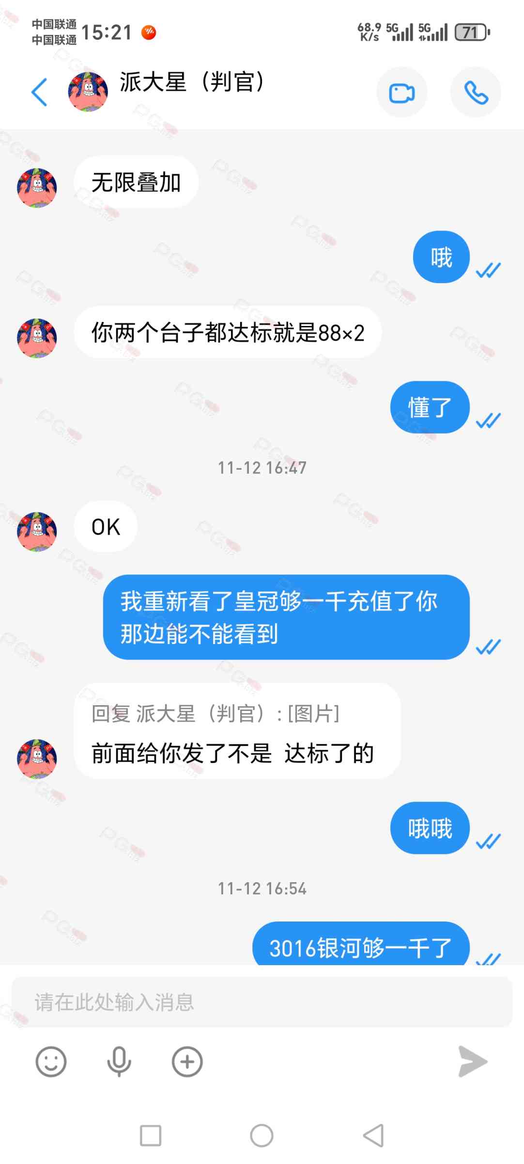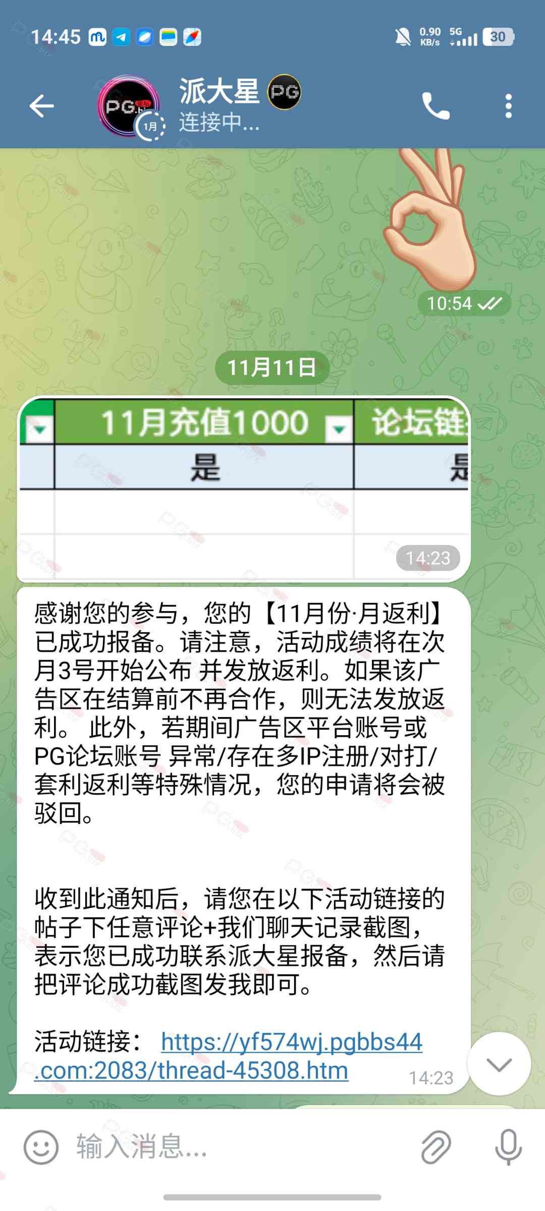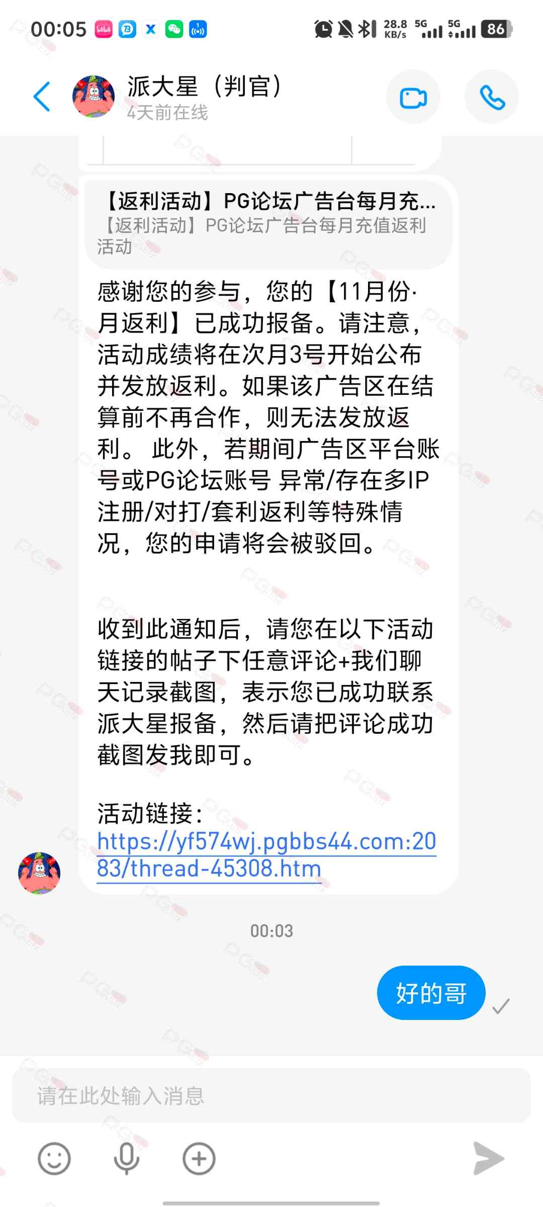 3.向派大星申请后,需要派大星跟狗庄确认是否走论坛链接,充值是否达标,核对后他会告知你是否成功报备,才算有效报备