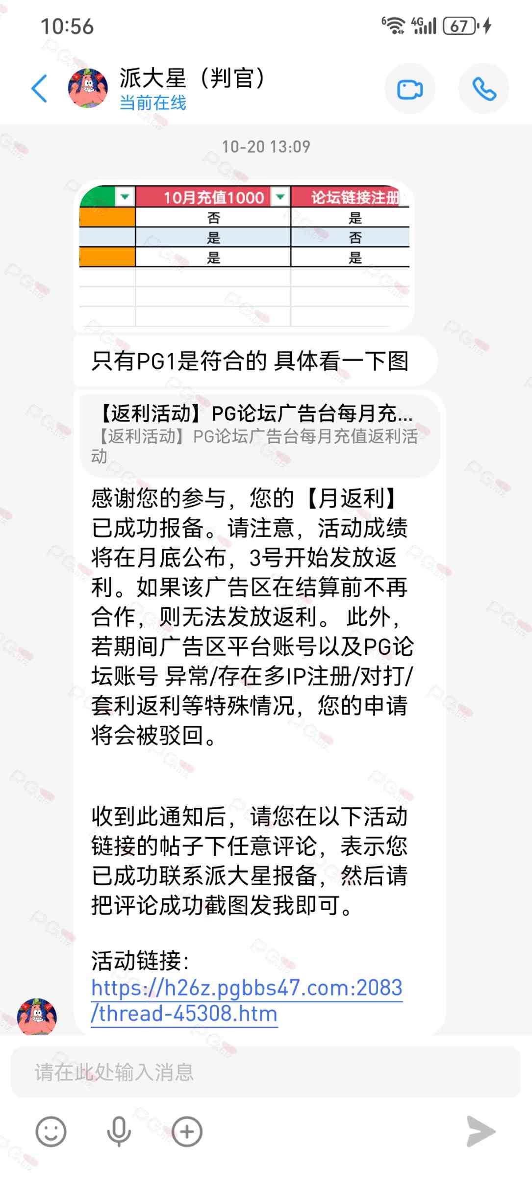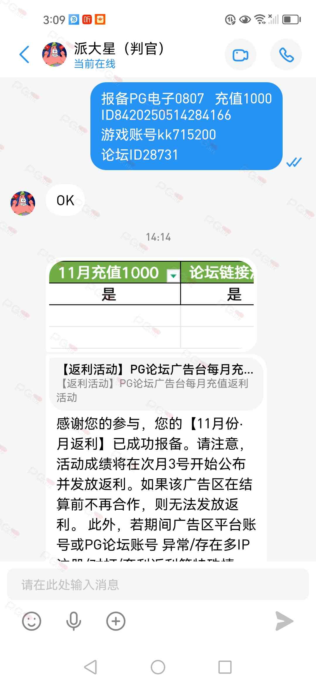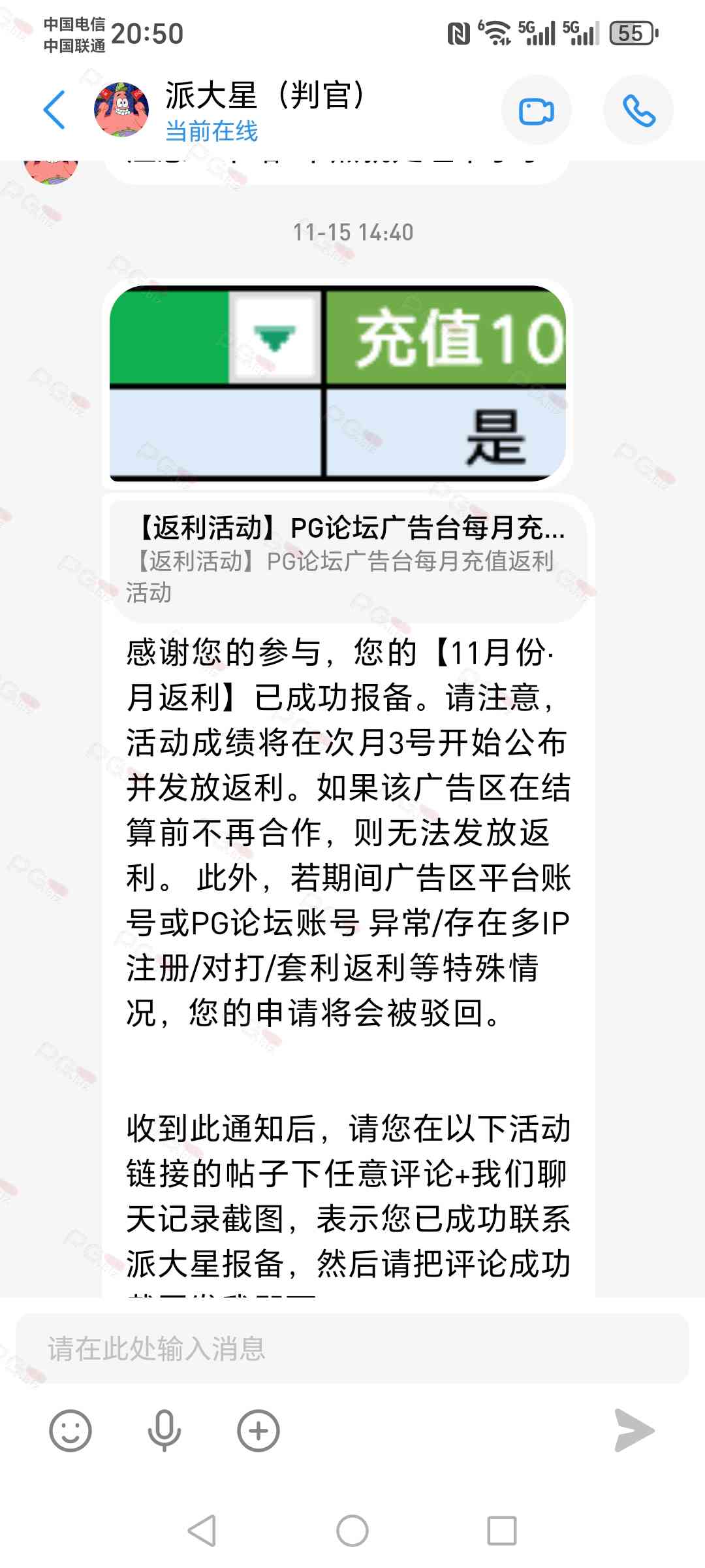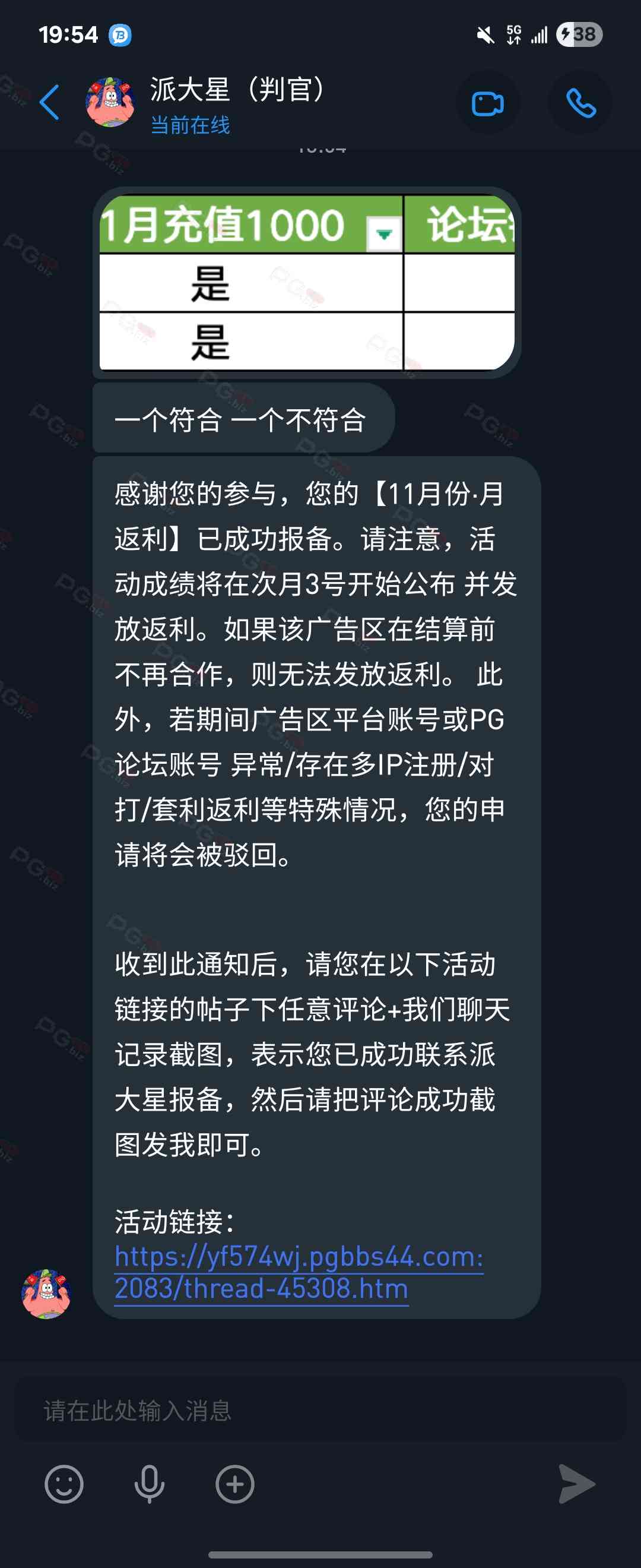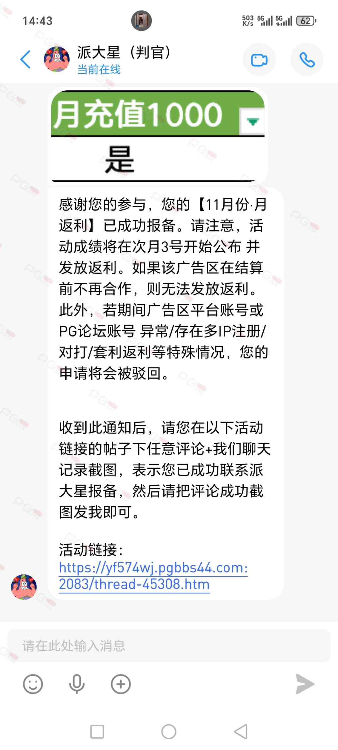 只要您在PG论坛任何一个广告区内的台子充值超过一千元,请即刻联系派大星报备,一个台子有50个名额,只要是前50名的申请的都可在下个月3号得到返利88元,不同台子可以重复申请,例如您在台子A和台子B都充值了超过一千元,都可以一齐申请,得到双份奖励!只限前50名,必须是论坛链接注册的,如果不是论坛链接注册的申请无效!