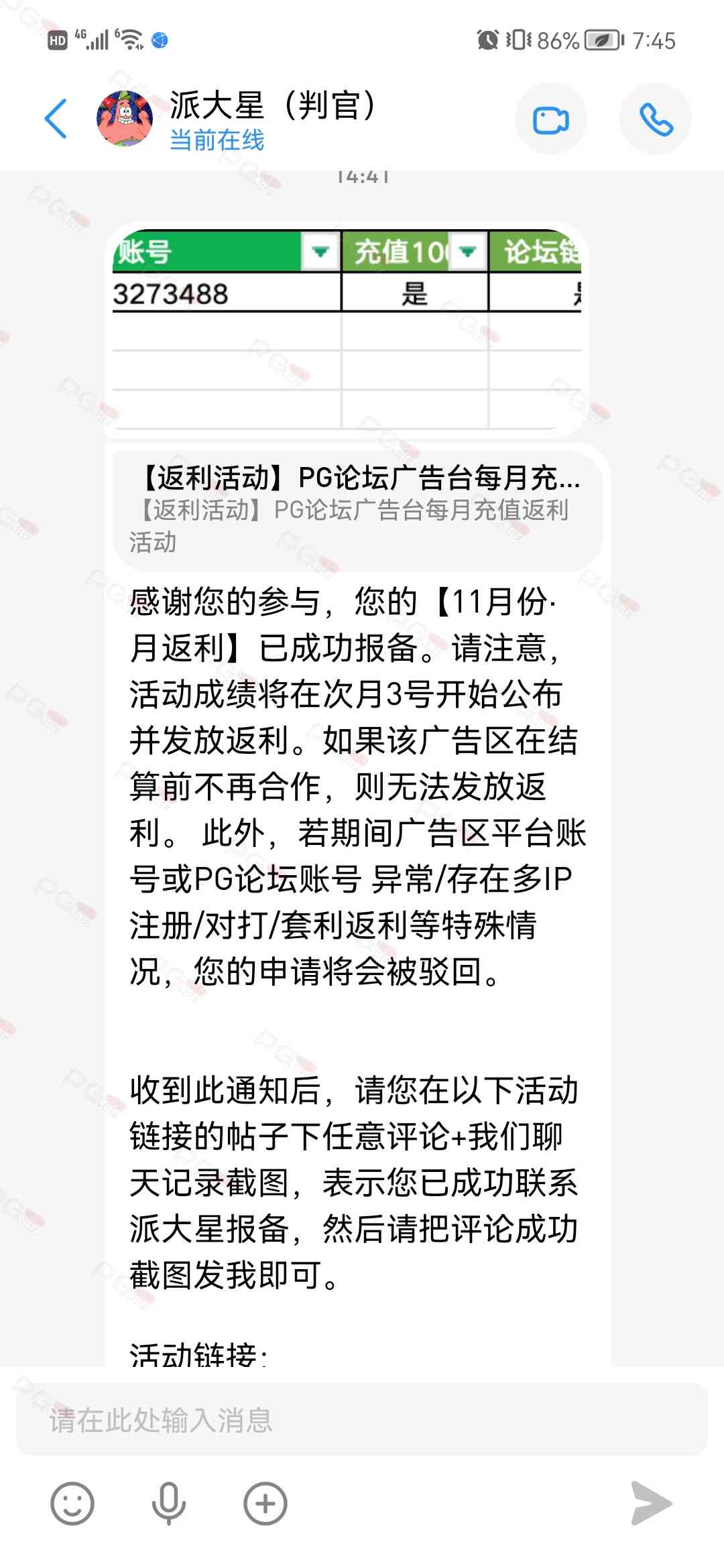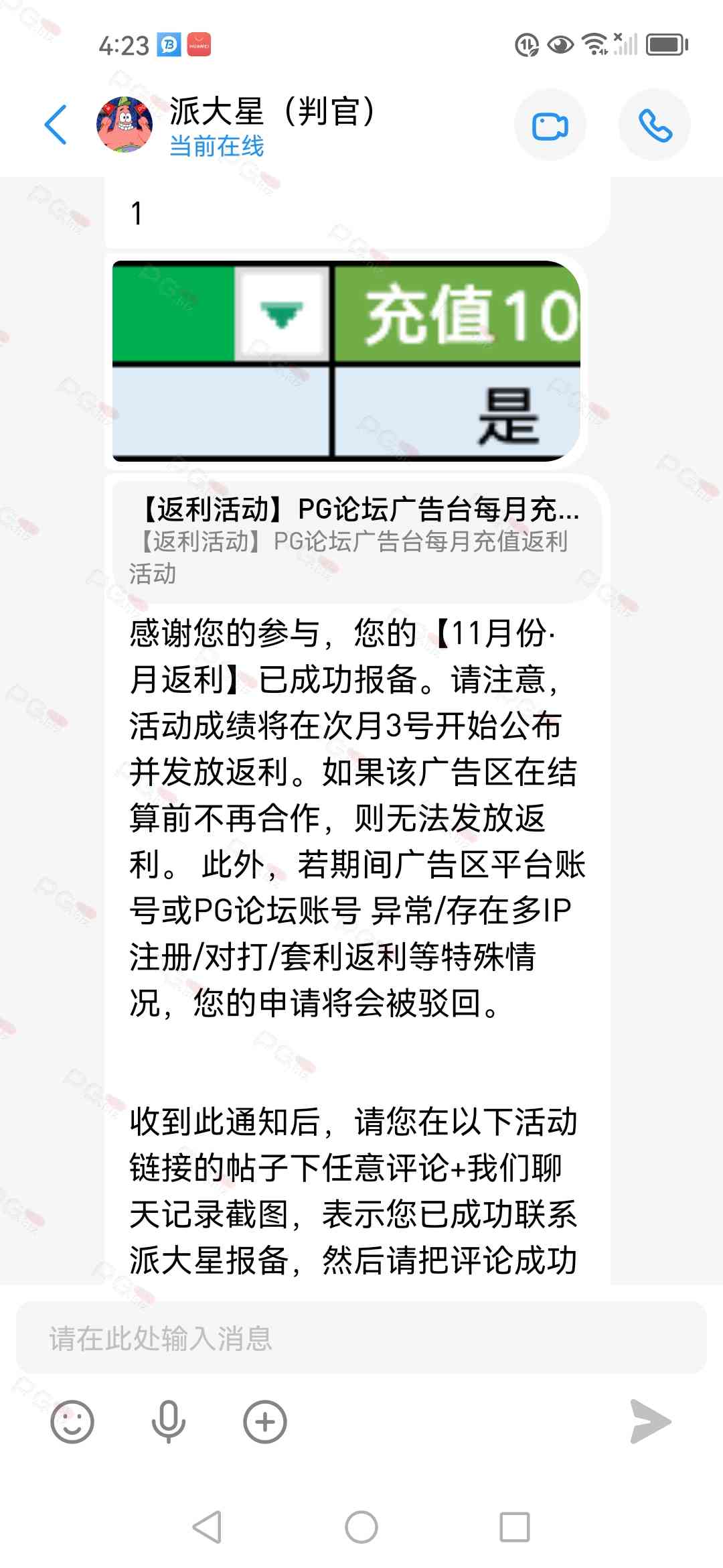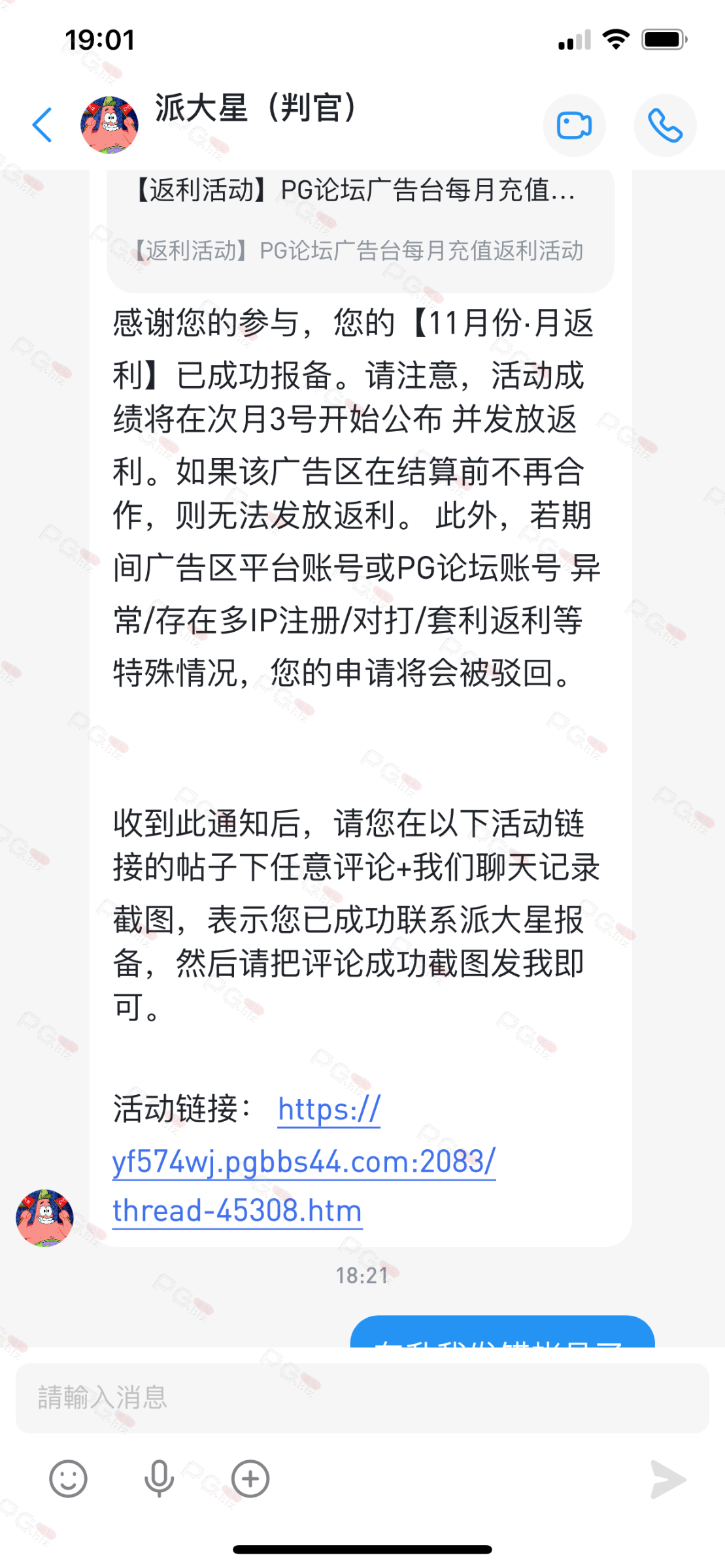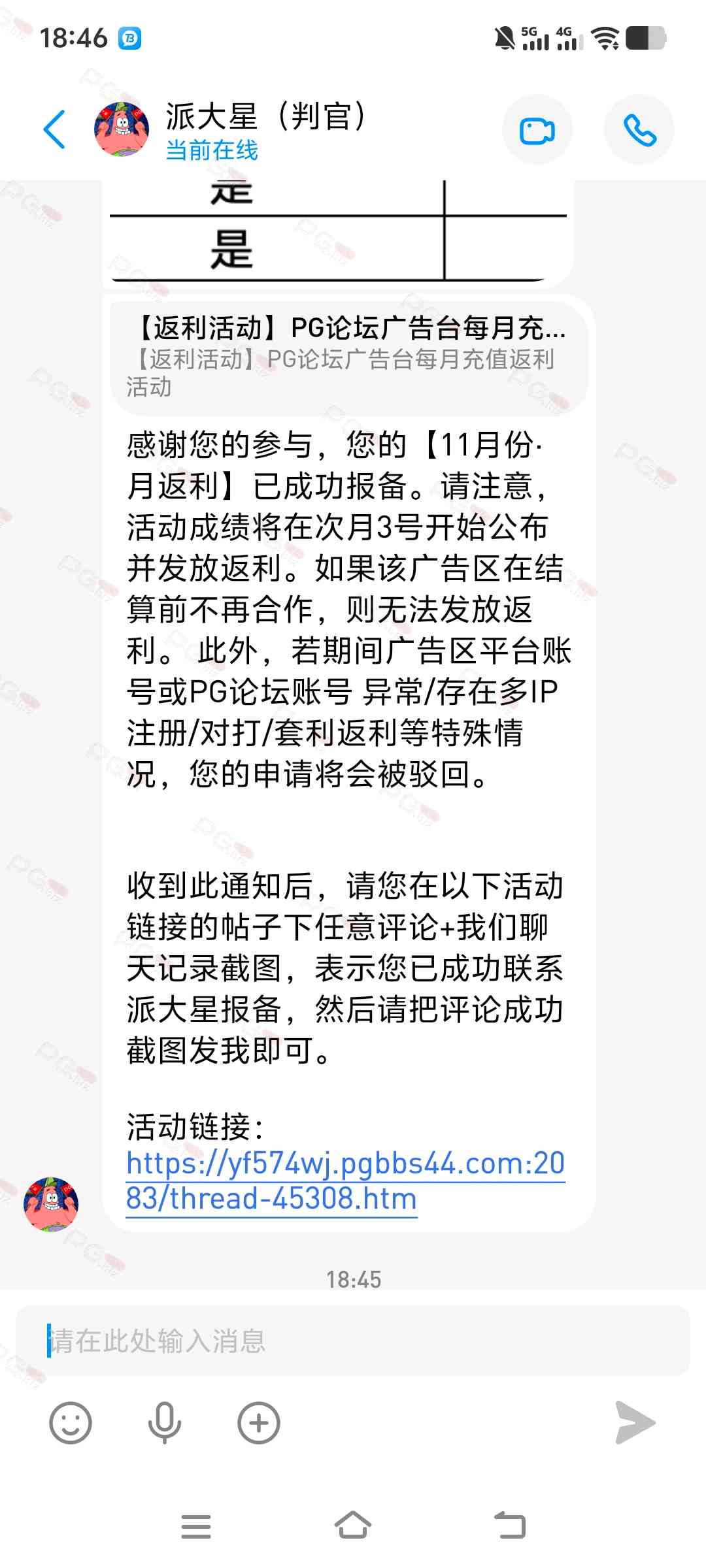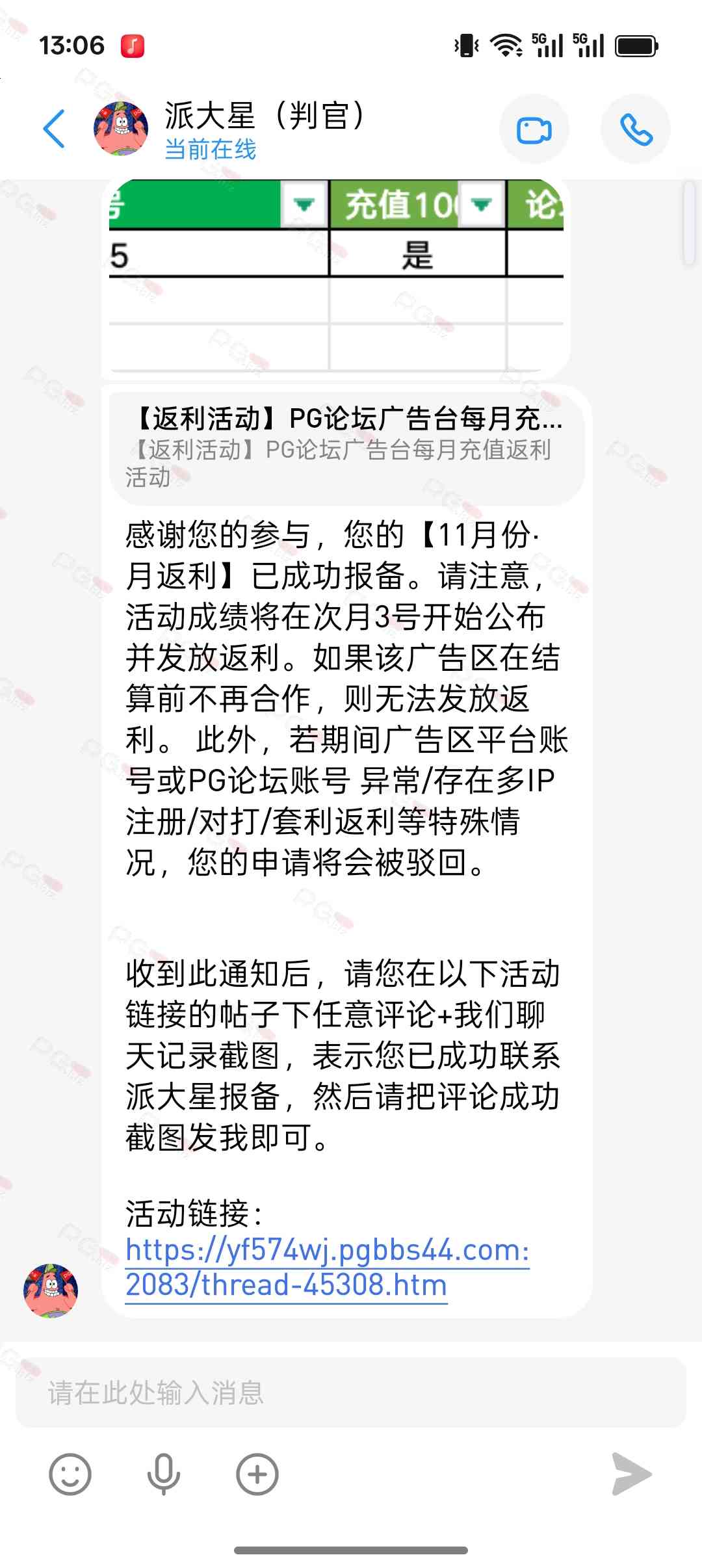 只要您在PG论坛任何一个广告区内的台子充值超过一千元,请即刻联系派大星报备,一个台子有50个名额,只要是前50名的申请的都可在下个月3号得到返利88元,不同台子可以重复申请,例如您在台子A和台子B都充值了超过一千元,都可以一齐申请,得到双份奖励!只限前50名,必须是论坛链接注册的,如果不是论坛链接注册的申请无效!