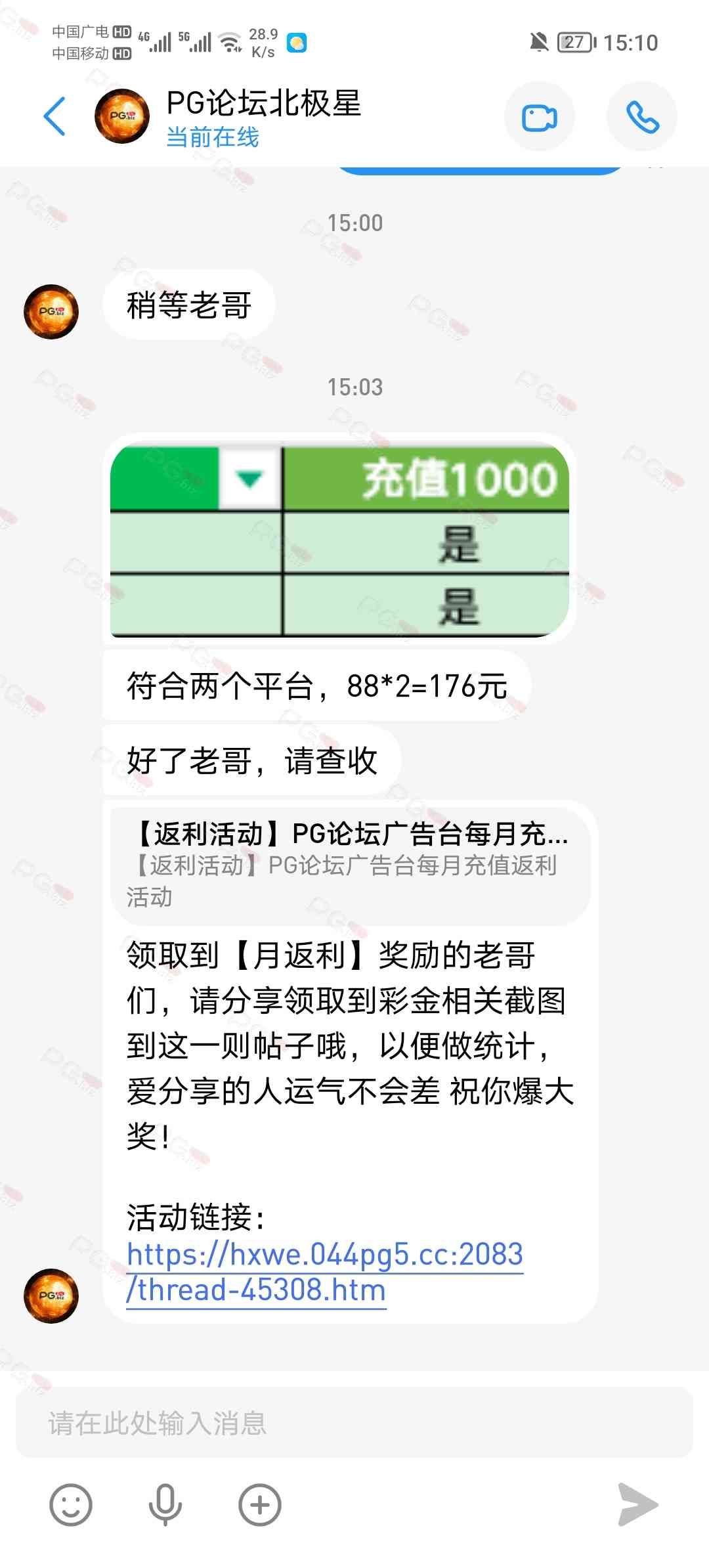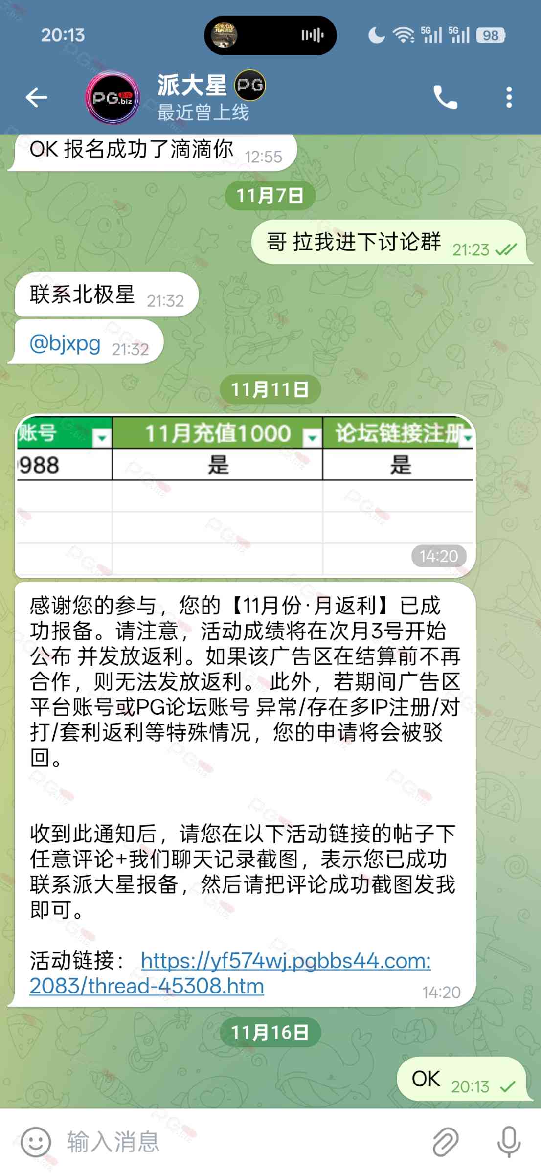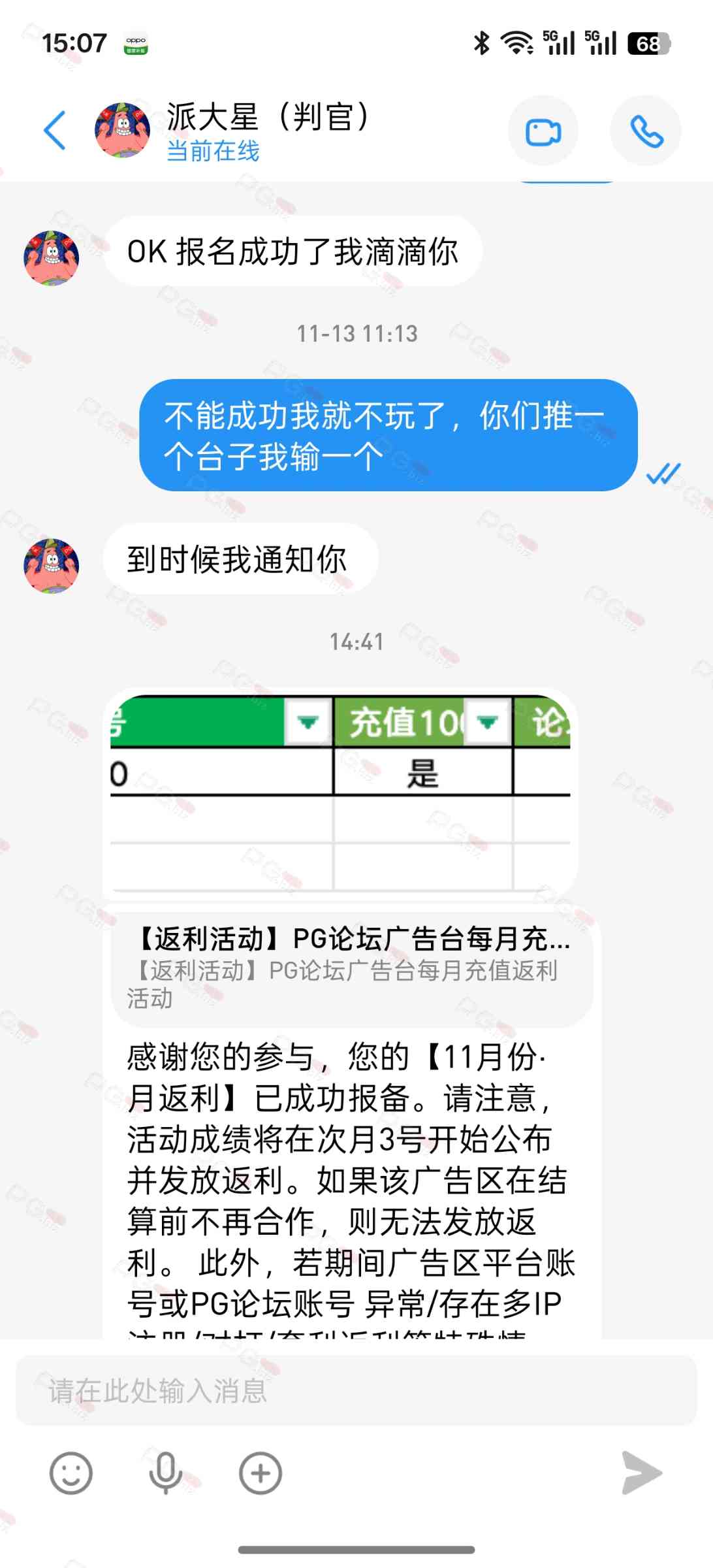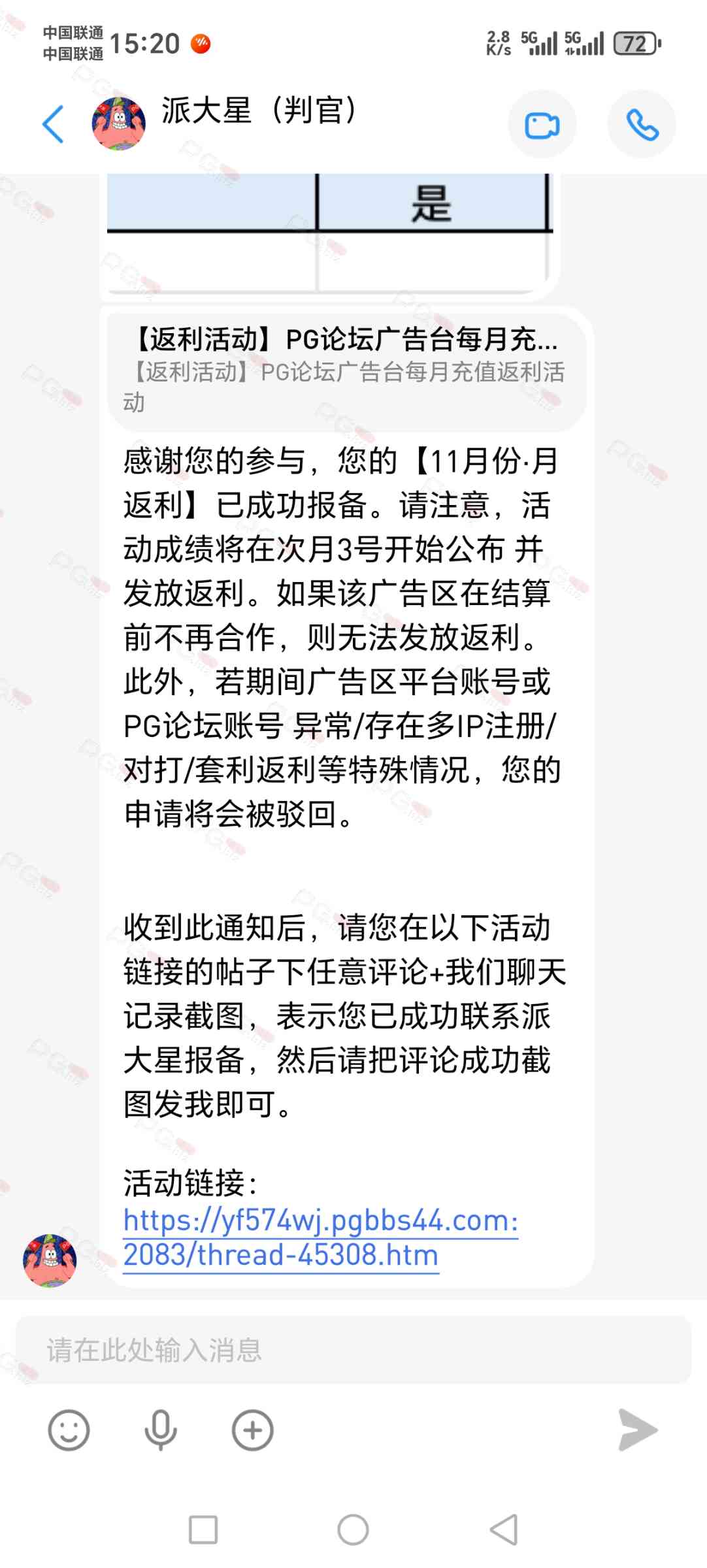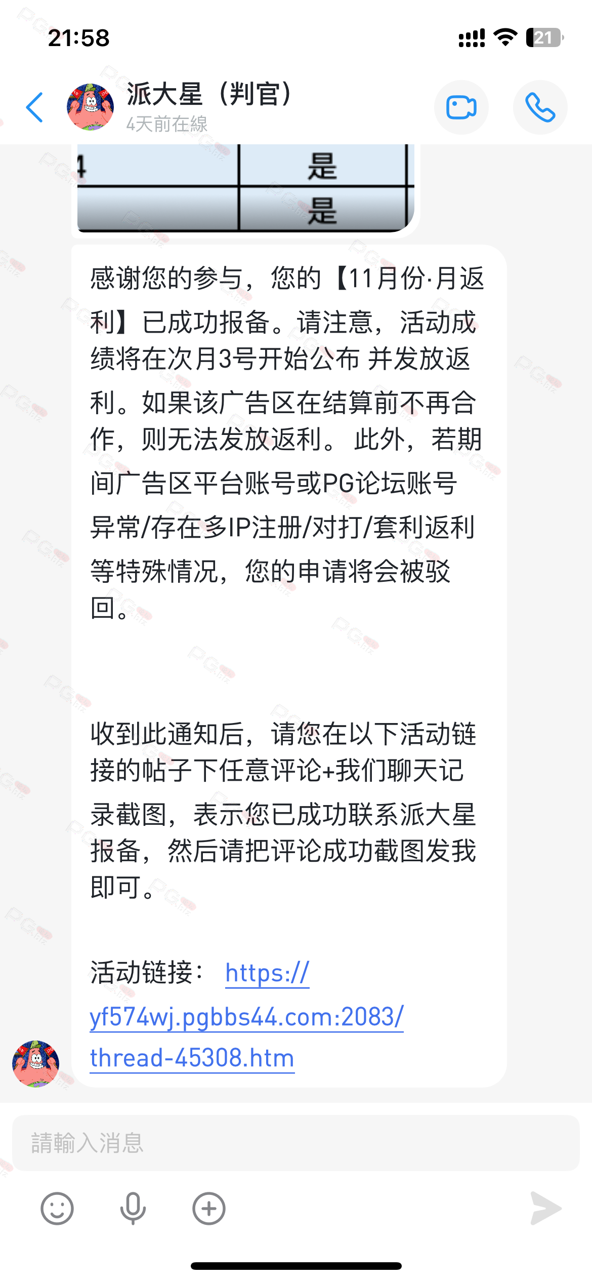 只要您在PG论坛任何一个广告区内的台子充值超过一千元,请即刻联系派大星报备,一个台子有50个名额,只要是前50名的申请的都可在下个月3号得到返利88元,不同台子可以重复申请,例如您在台子A和台子B都充值了超过一千元,都可以一齐申请,得到双份奖励!只限前50名,必须是论坛链接注册的,如果不是论坛链接注册的申请无效!