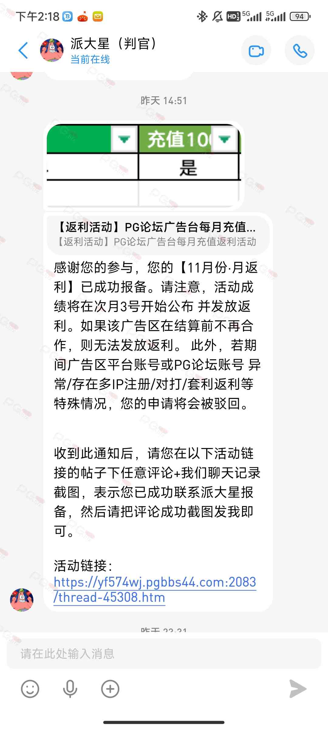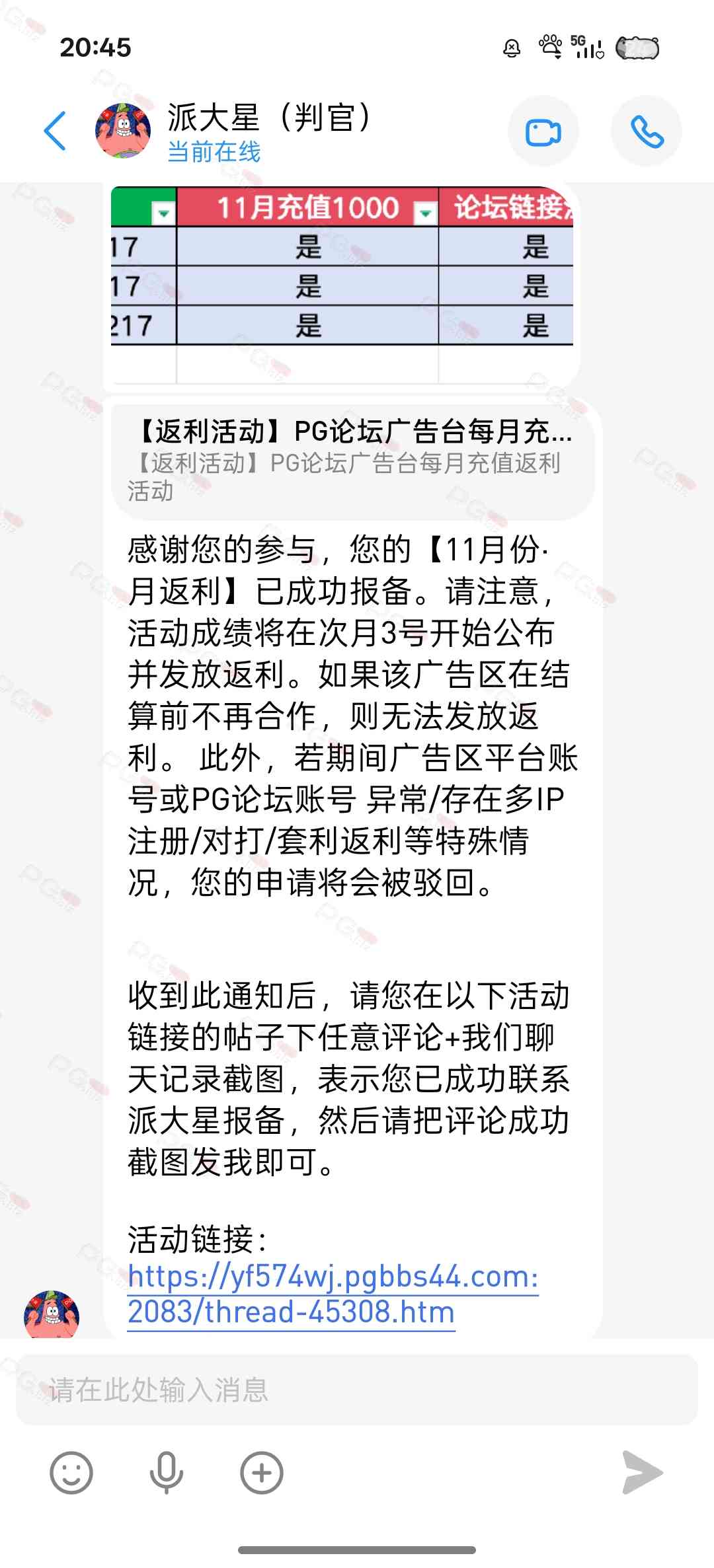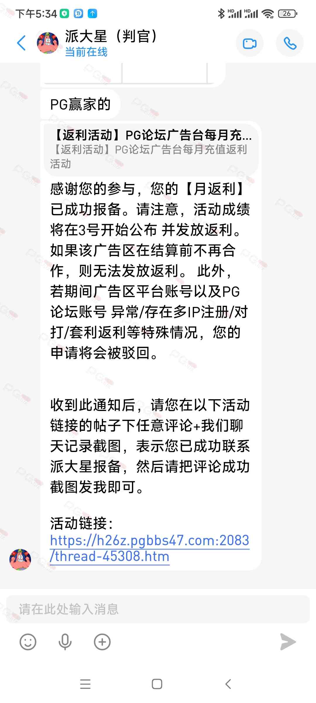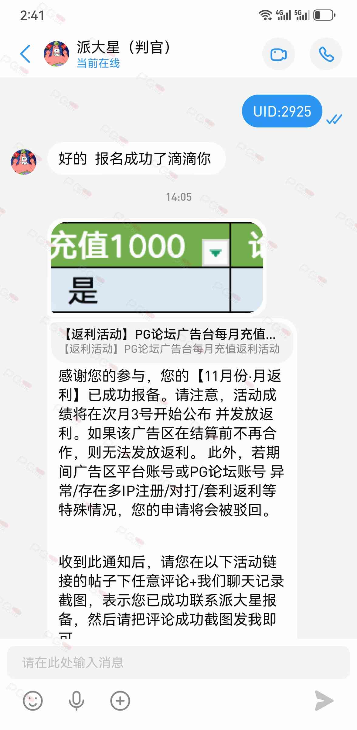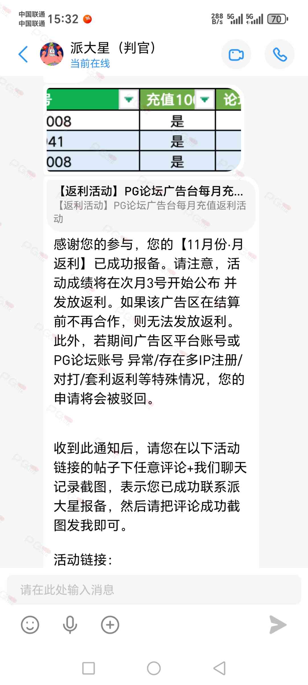 只要您在PG论坛任何一个广告区内的台子充值超过一千元,请即刻联系派大星报备,一个台子有50个名额,只要是前50名的申请的都可在下个月3号得到返利88元,不同台子可以重复申请,例如您在台子A和台子B都充值了超过一千元,都可以一齐申请,得到双份奖励!只限前50名,必须是论坛链接注册的,如果不是论坛链接注册的申请无效!