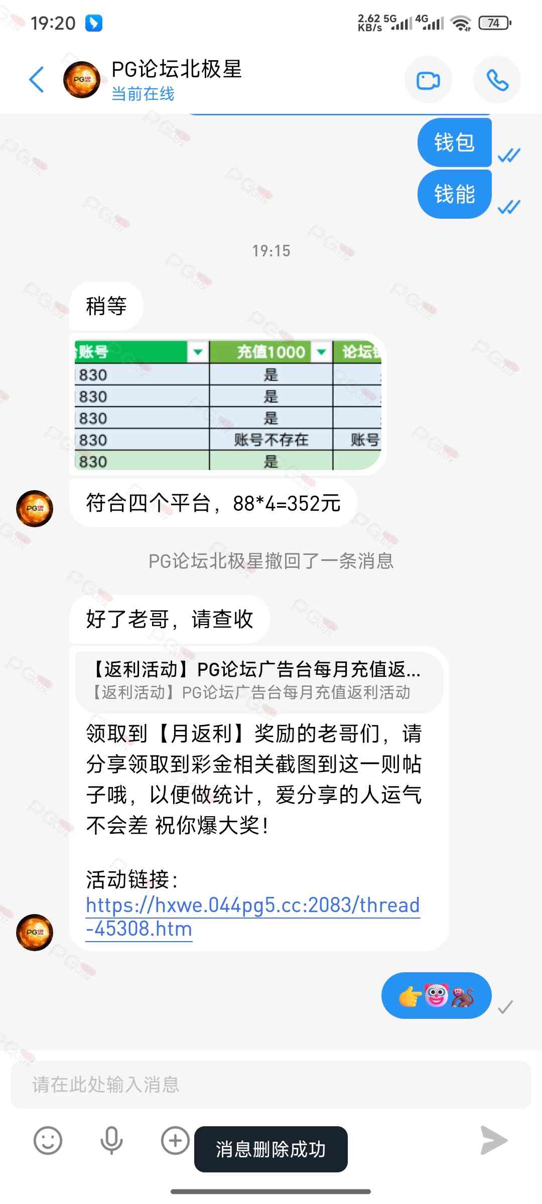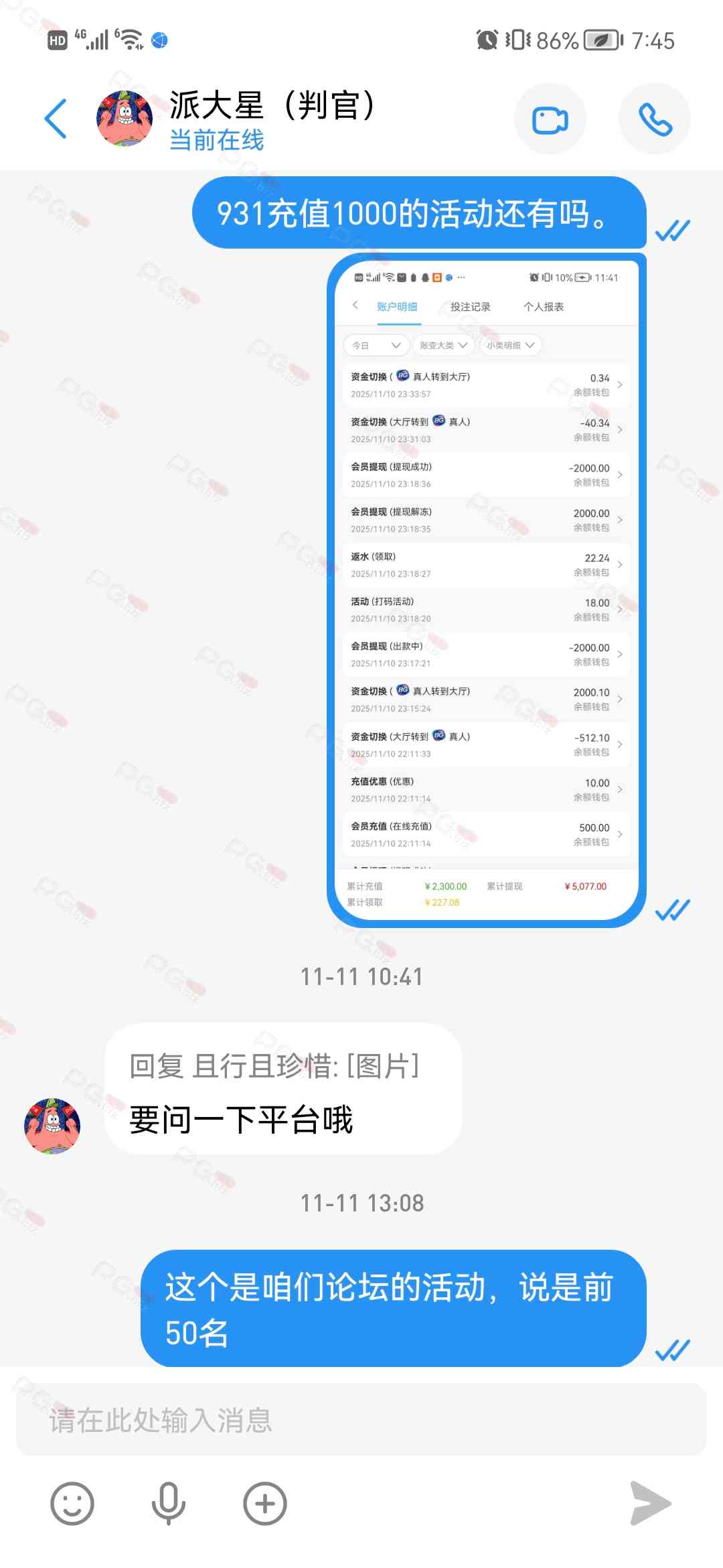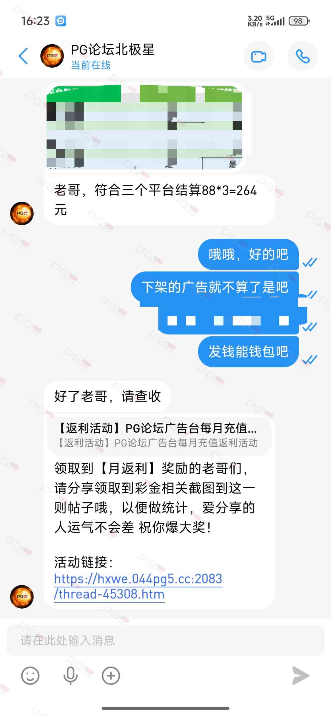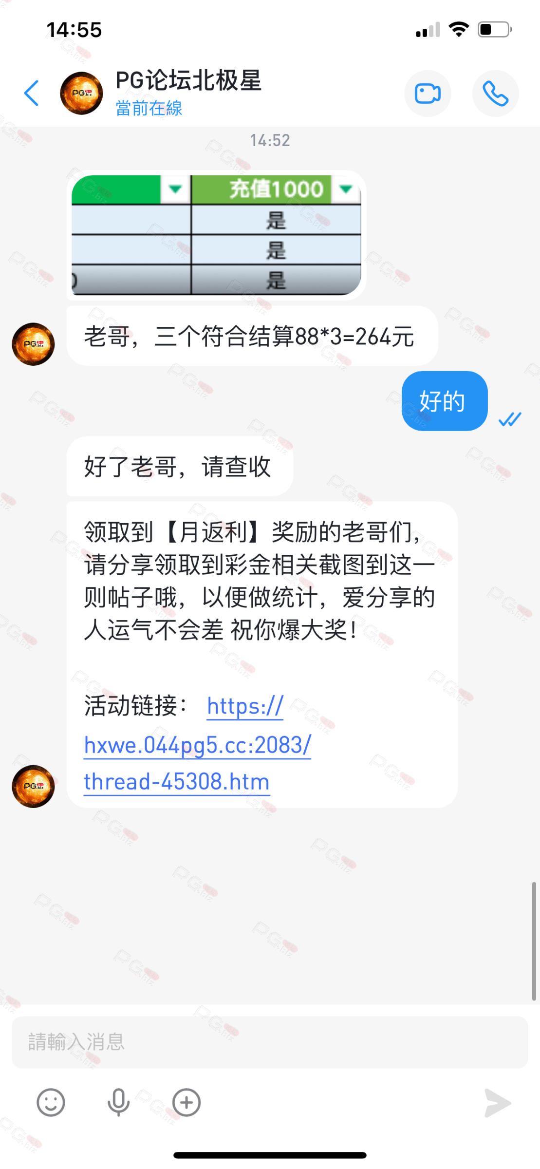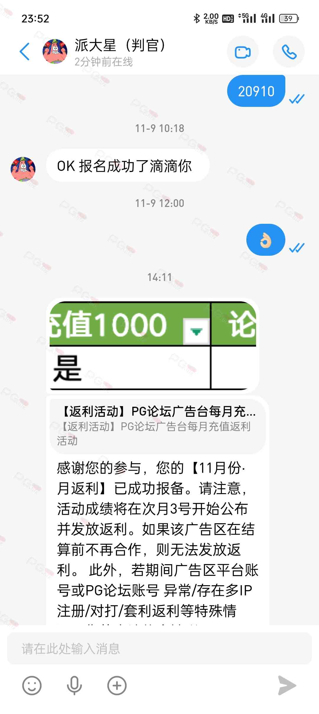 只要您在PG论坛任何一个广告区内的台子充值超过一千元,请即刻联系派大星报备,一个台子有50个名额,只要是前50名的申请的都可在下个月3号得到返利88元,不同台子可以重复申请,例如您在台子A和台子B都充值了超过一千元,都可以一齐申请,得到双份奖励!只限前50名,必须是论坛链接注册的,如果不是论坛链接注册的申请无效!