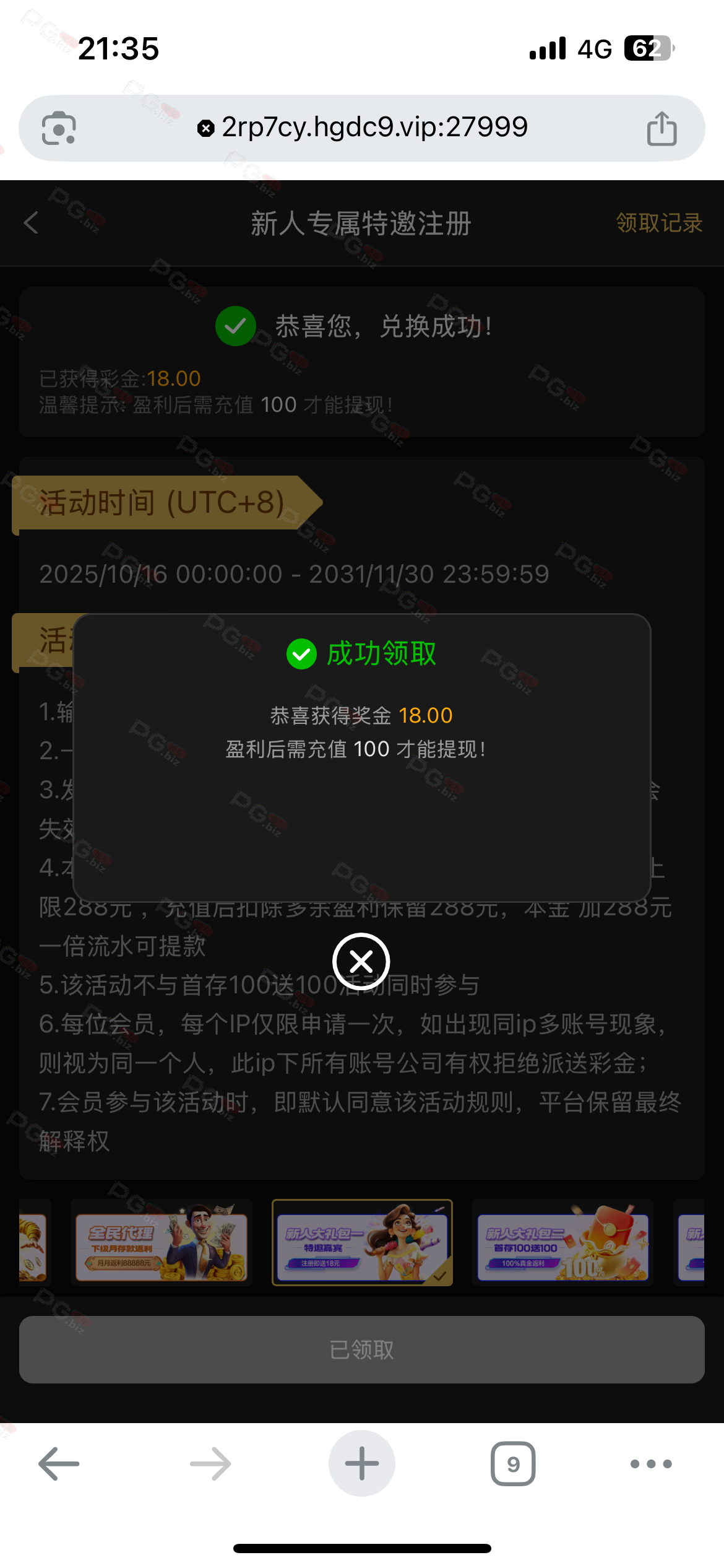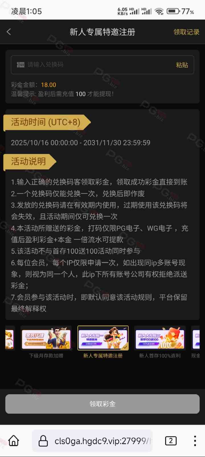 需使用PG论坛链接注册,然后在论坛的商城里面兑换彩金码,需论坛链接注册才能看到优惠活动界面,进入下列活动内输入彩金码即可获得18元彩金,需当日注册的才可以领取。