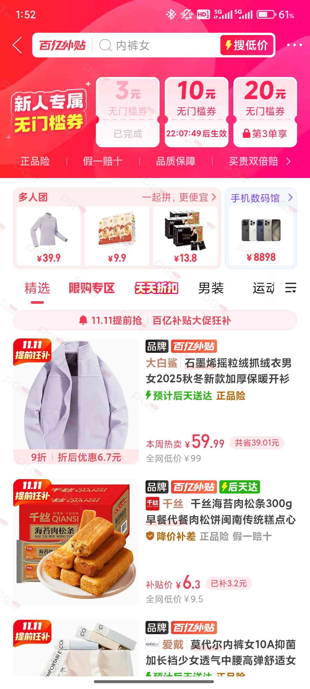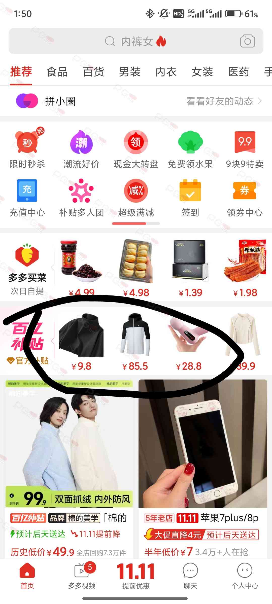 拼多多用qq号登陆,尽量用没用过的小号或不常用的号。点圈出来的这个百亿补贴就会有3张无门槛券,第一天的用了,才会给第二天的,同第三天,只能买百亿补贴的,主要用后面两天的,撸点米面泡面,省的挂壁饿肚子