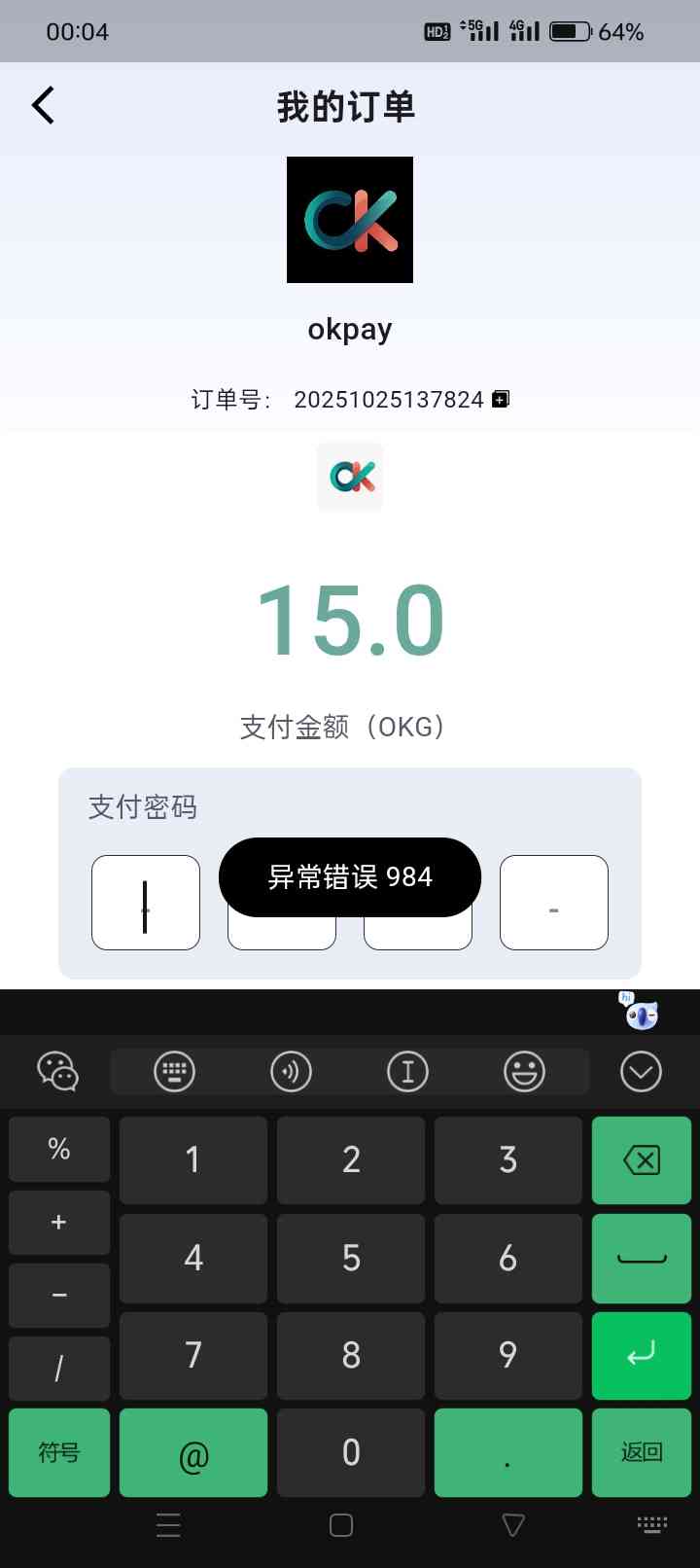 有没有大佬知道ok钱包?突然显示异常错误984是怎么回事 就是昨天卖币的时候 有一笔25 对方把钱付过来了 但是他没有确认付款,我这里不可以打币,然后他取消订单了 没过多久,软件就成这样了 买币卖币都显示异常错误984