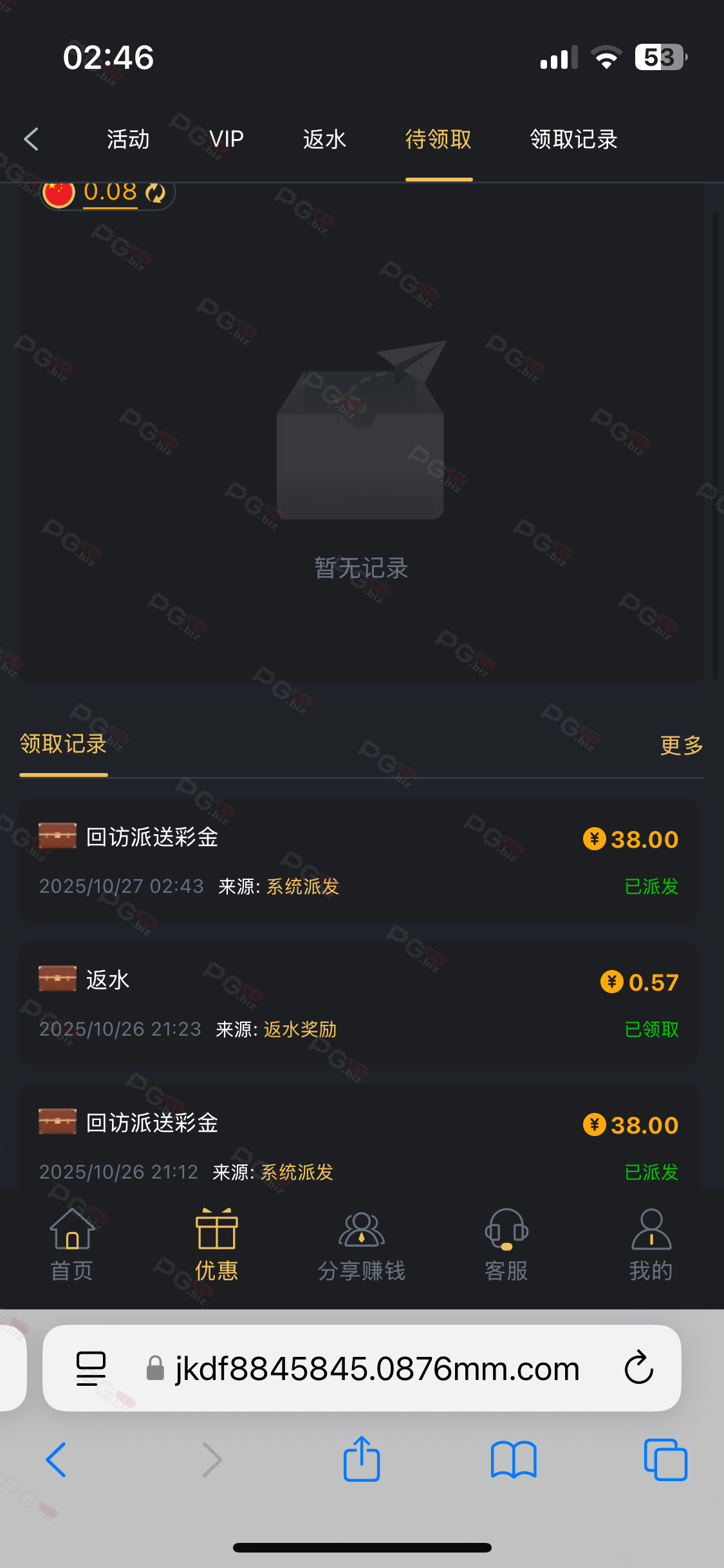 这个台送了两个回访彩金给我,一天一个,我打出了500,没有找客服看一下