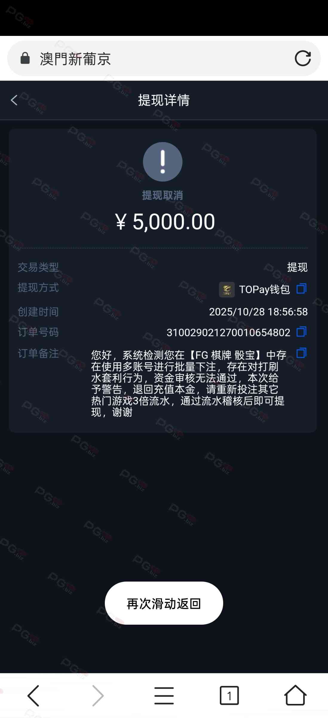 充1000玩FG骰宝玩到5000说我多账号批量投注,太6了,这垃圾台就喜欢找这种理由,退回本金还要三倍流水,直接洗白了