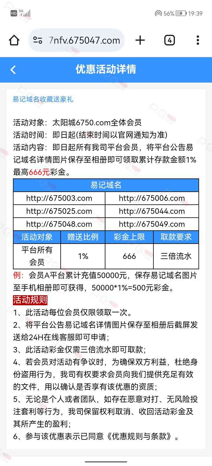 无聊翻找白菜 发现收藏里面有个23年注册的太阳城6750 以前叫太阳城230 我充值玩过几次 就想登上去看有没有活动回馈 发现有活动 收藏首页的横幅易记域名图片 可以免费找客服领取充值本金百分之一的彩金 具体规则看下面图片 我领了三十多 有以前充值玩过的老哥可以去