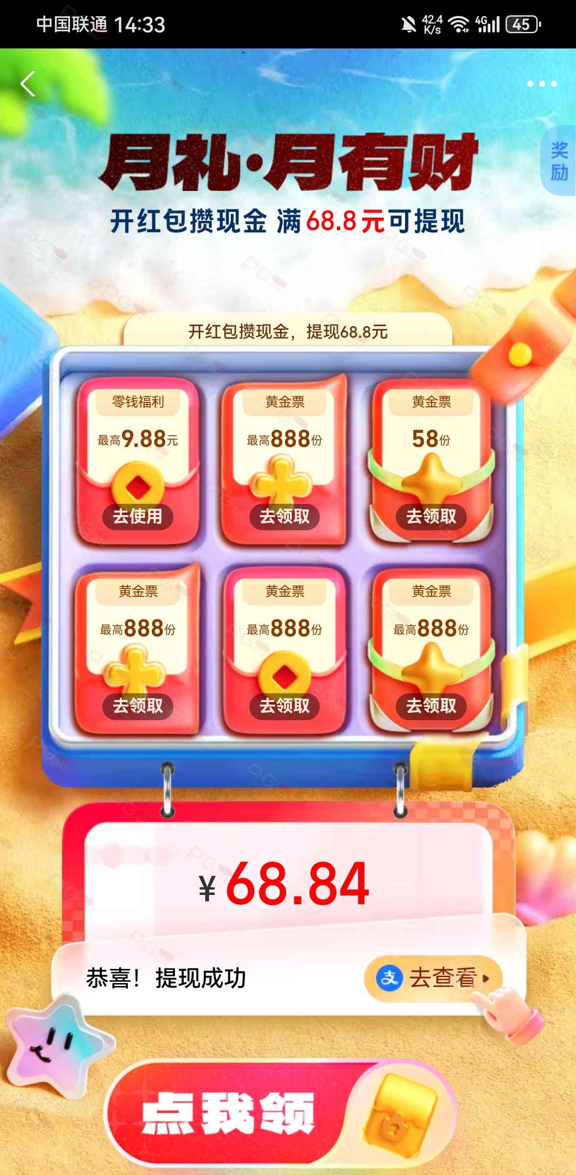支付宝打开点左下角第二个理财,然后搜月礼,进去红包开一下然后领完有提现点提现,进去抽奖,10次必得70,没有提现就换其他支付宝,3个小时到账,接个电话就行