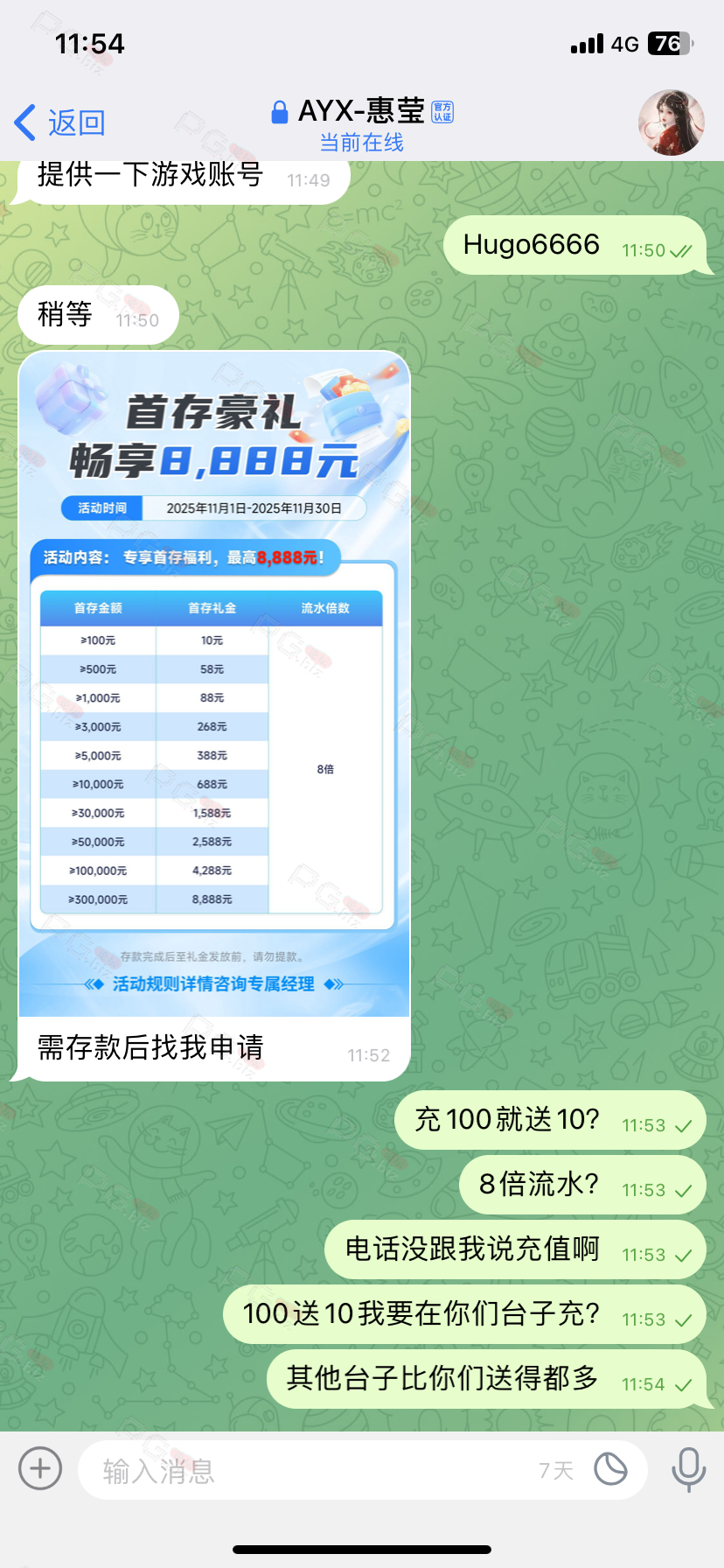 爱游戏打电话说回归送彩金,联系客服要下载一个软件,登上去联系客服结果要充值!完了,充100才送10还要8倍流水