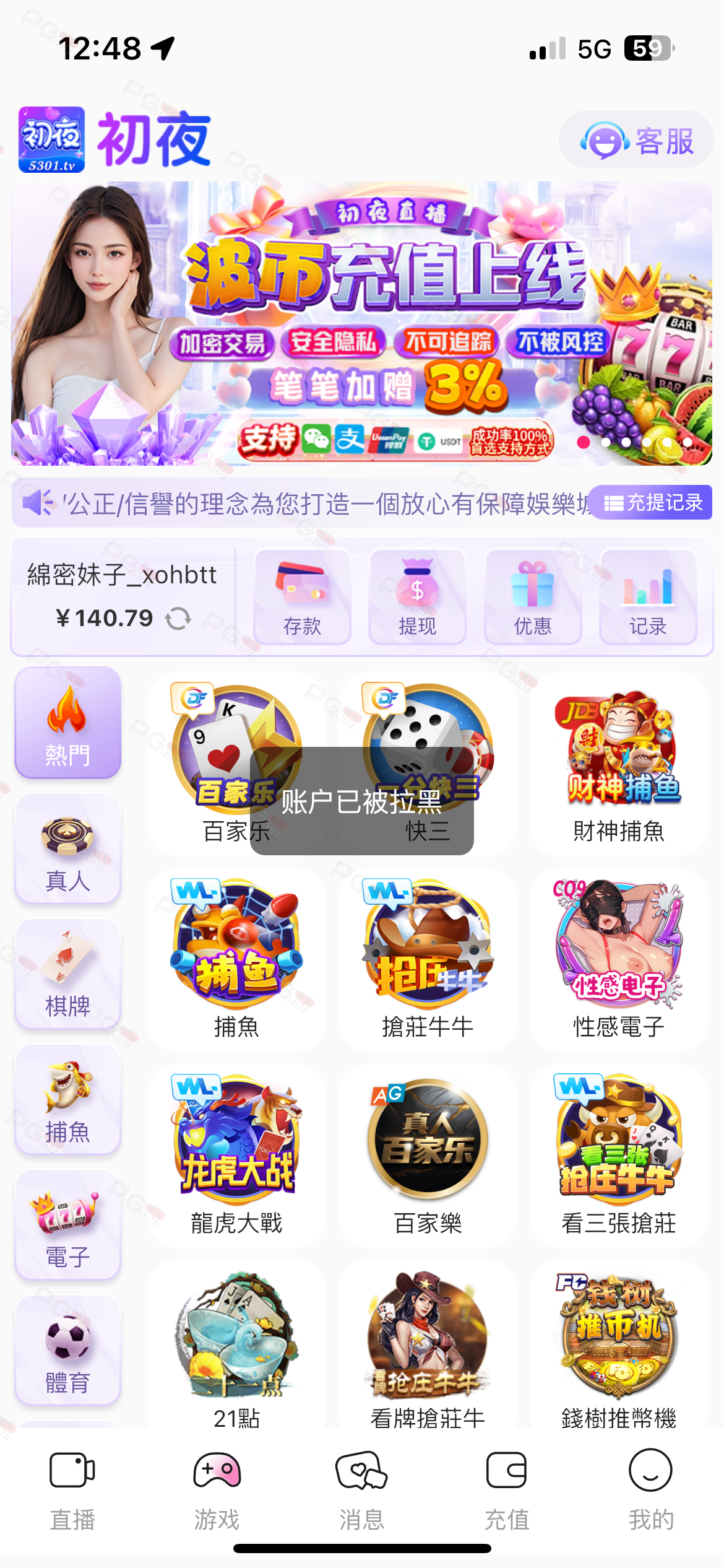 我在论坛帖子里找了玩的 充了50提100都拉黑了 黄播我第一次被拉黑真的 我玩过不下100个黄播 从来没有过 所以我才敢充 无法了 避雷初夜直播