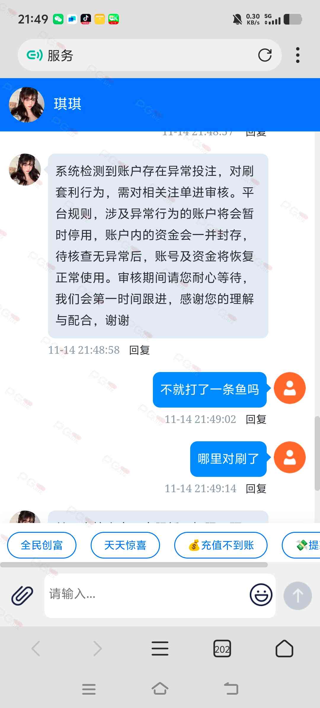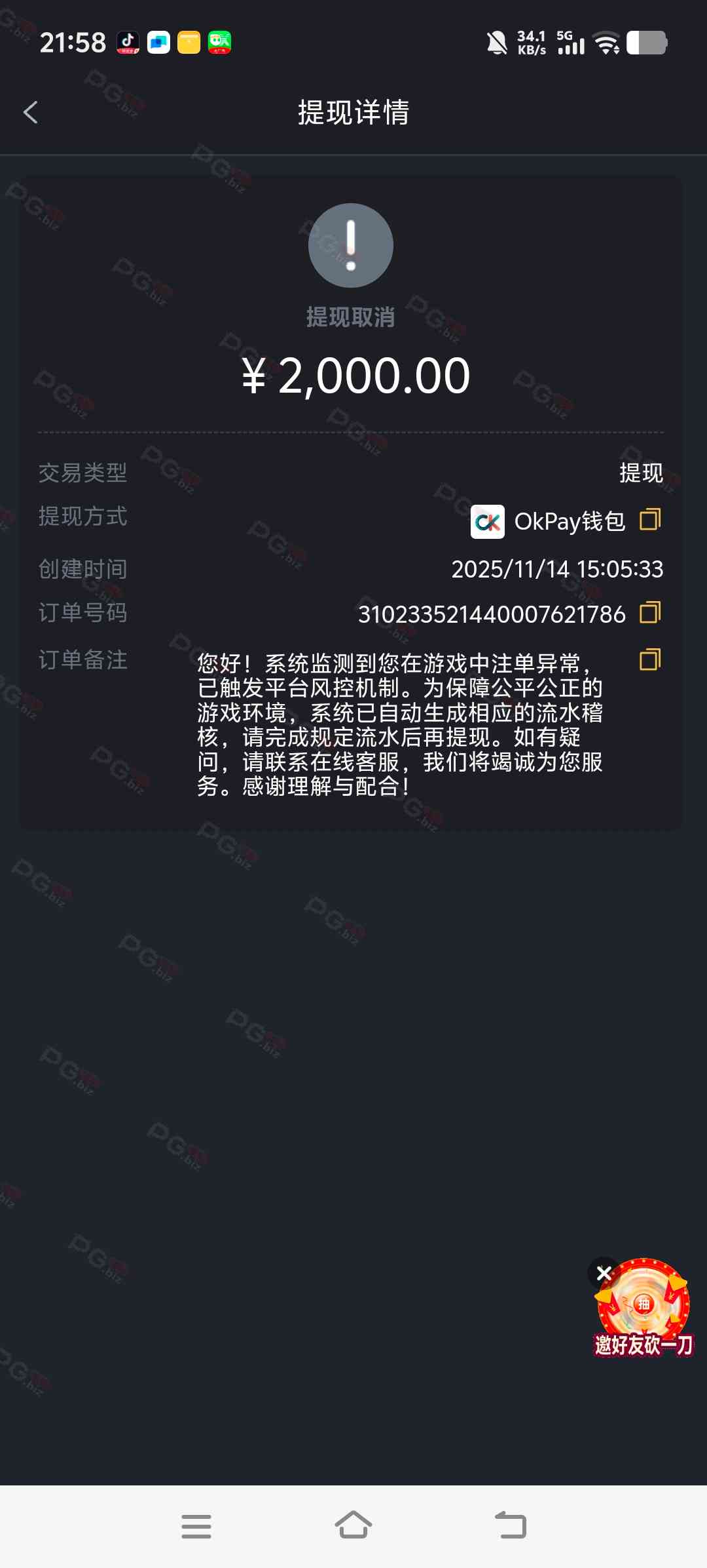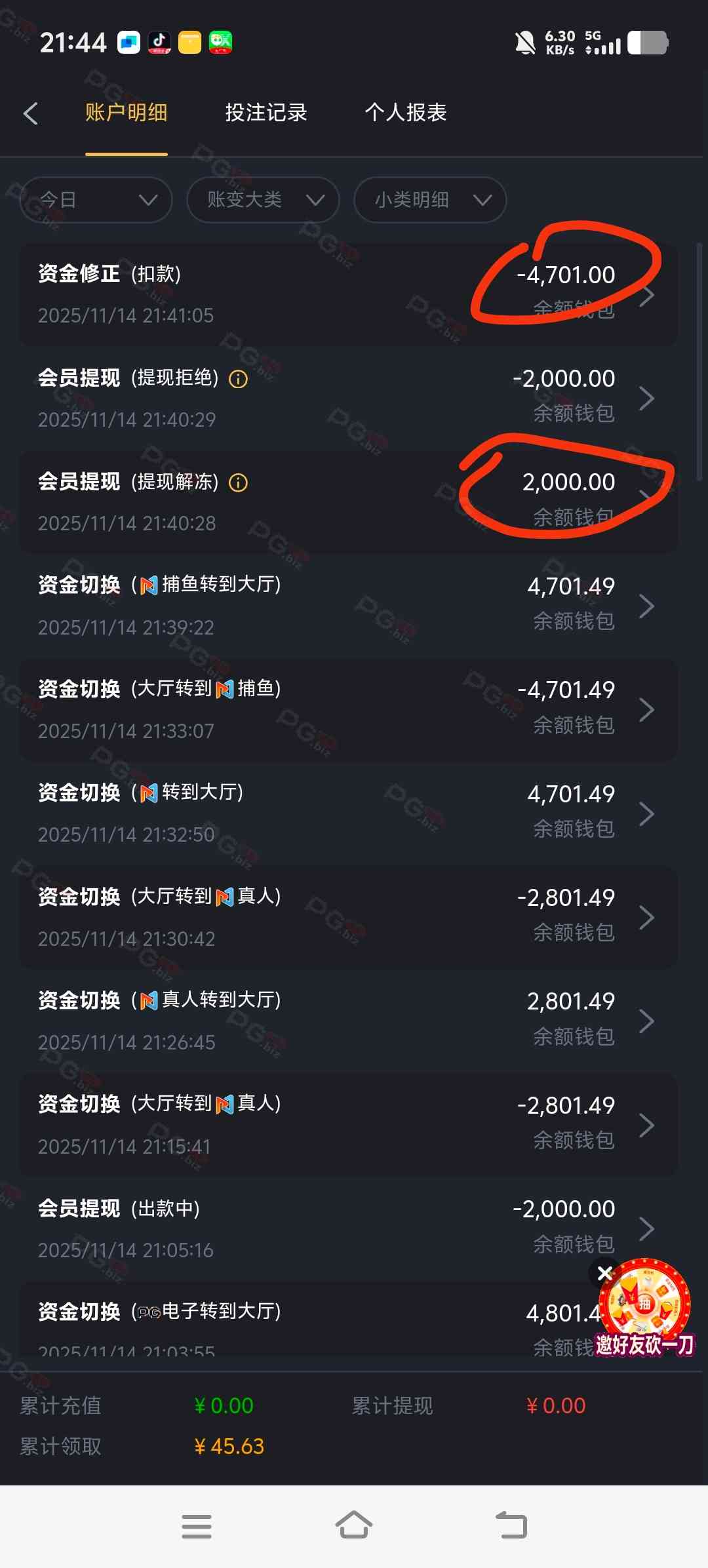本来是有40块钱,打了一条2千块钱的鱼,提现罚了十倍流水,打完2万块钱流水直接提现封号了,黑款的7600块。