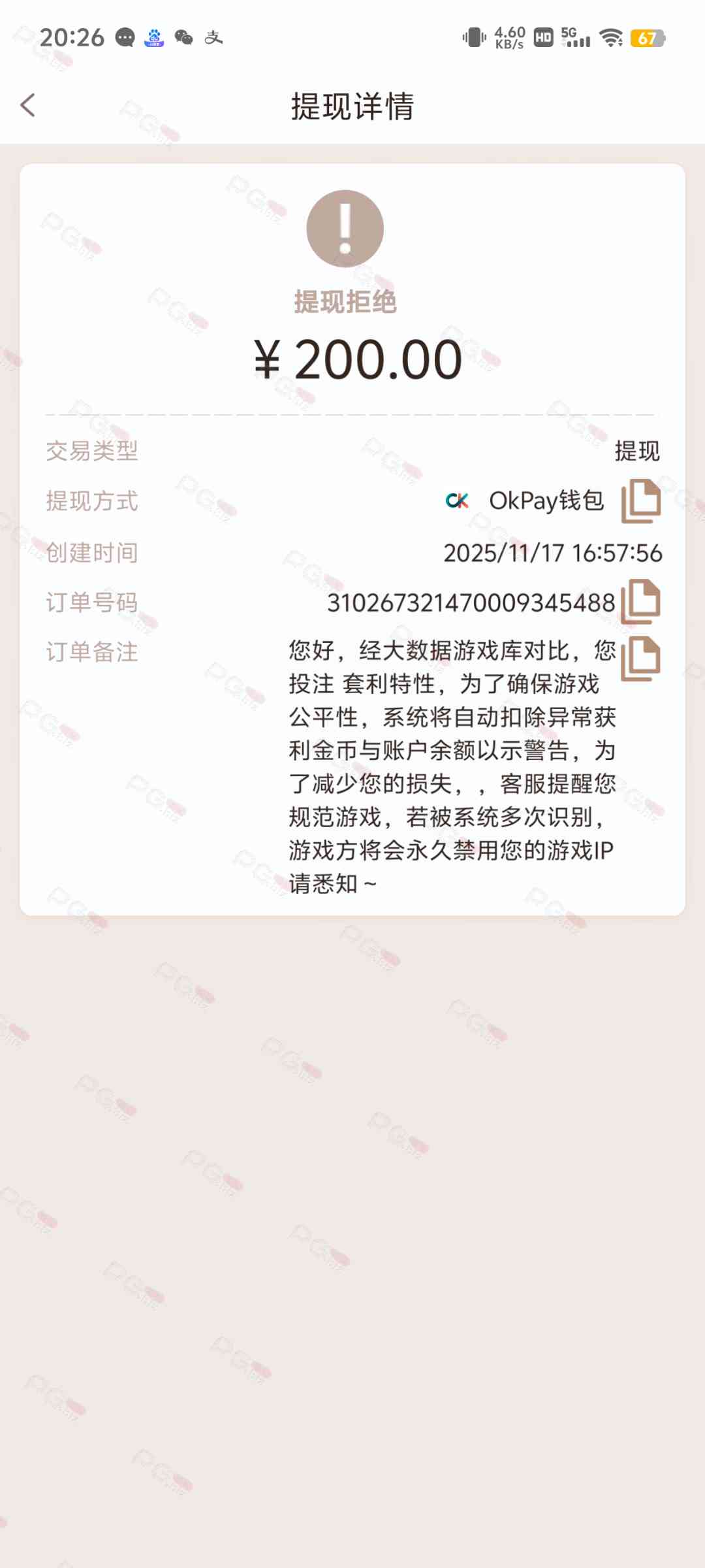 可没想到的是直接给我黑了,200直接黑了,扣除本金。垃圾台一点格局都没有,充值娱乐都被黑了,,,而且我还没有赢,重点是他说我套利,我操你妈呢,我套怎么了,请问利在哪。