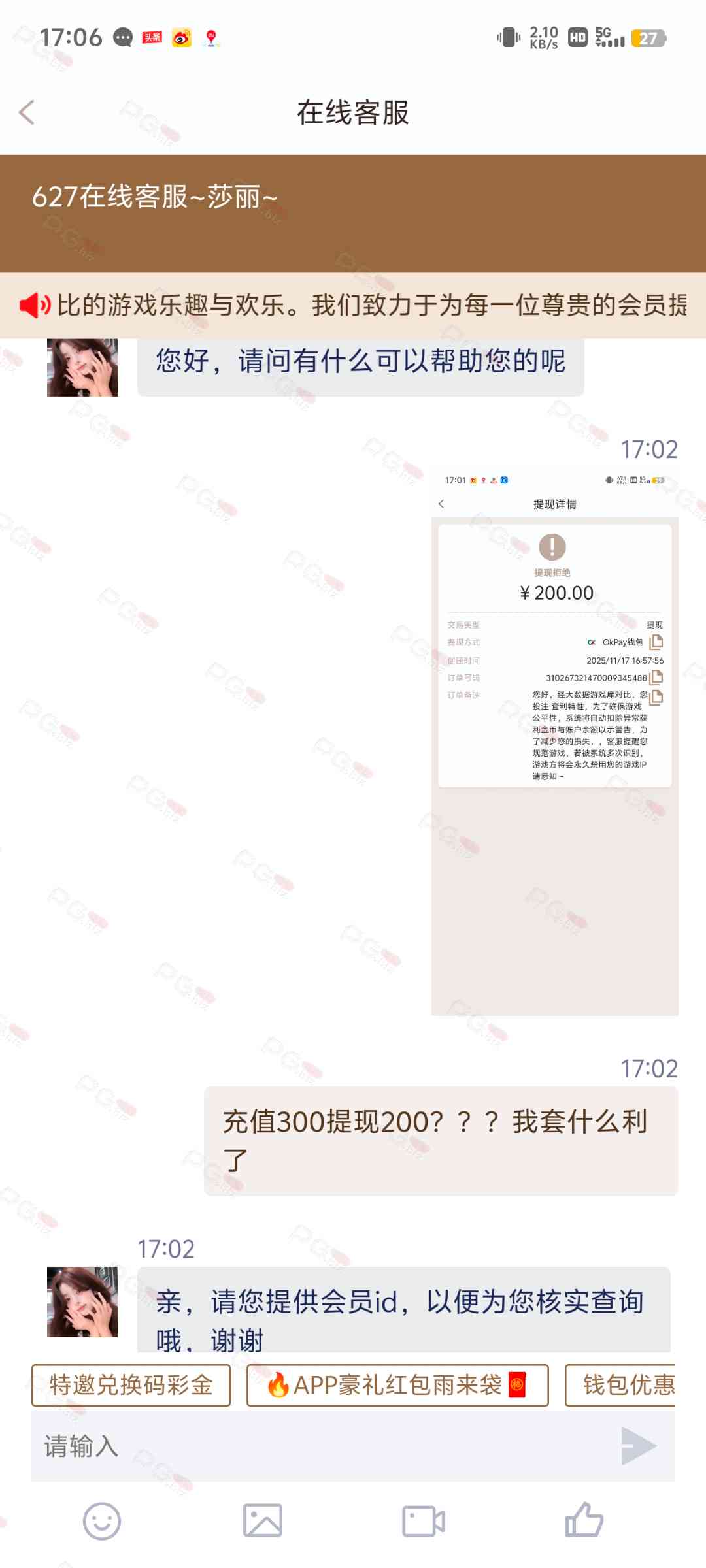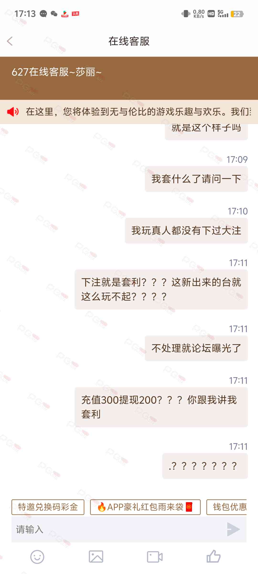 平台 所有的借口 理由都是不想给玩家提现!客服 都是复制粘贴过来的,我一个没有下级会员的,客服 复制粘贴过来一大段文字:你存在上下级套利,被我司列为重点观察对象,请停止该套利行为,否则,升级处罚。当我看完都傻眼了,我都没下线 何来上下级套利。 然后,客服 又发来:你帐号长期低流水套利。我明明半个月都没怎么玩了,何来长期低流水套利。这回,客服又说:注单异常。就是卡着不给提现。