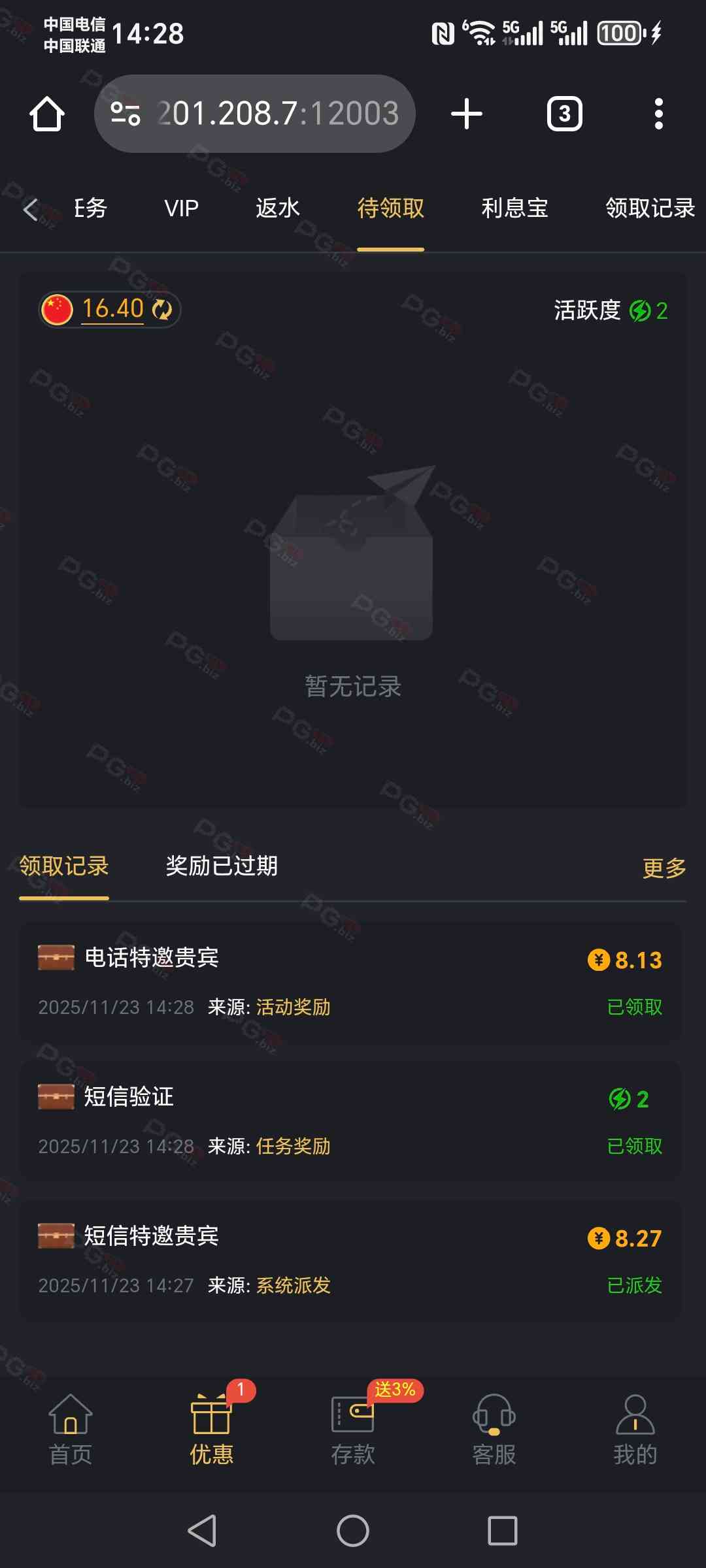 平台活动更新可以领取自助电话短信验证彩金了,我老用户也领到了,然后明天登录也还有2个活动,一个是保存网址送彩金一个登录app彩金,记得上去看