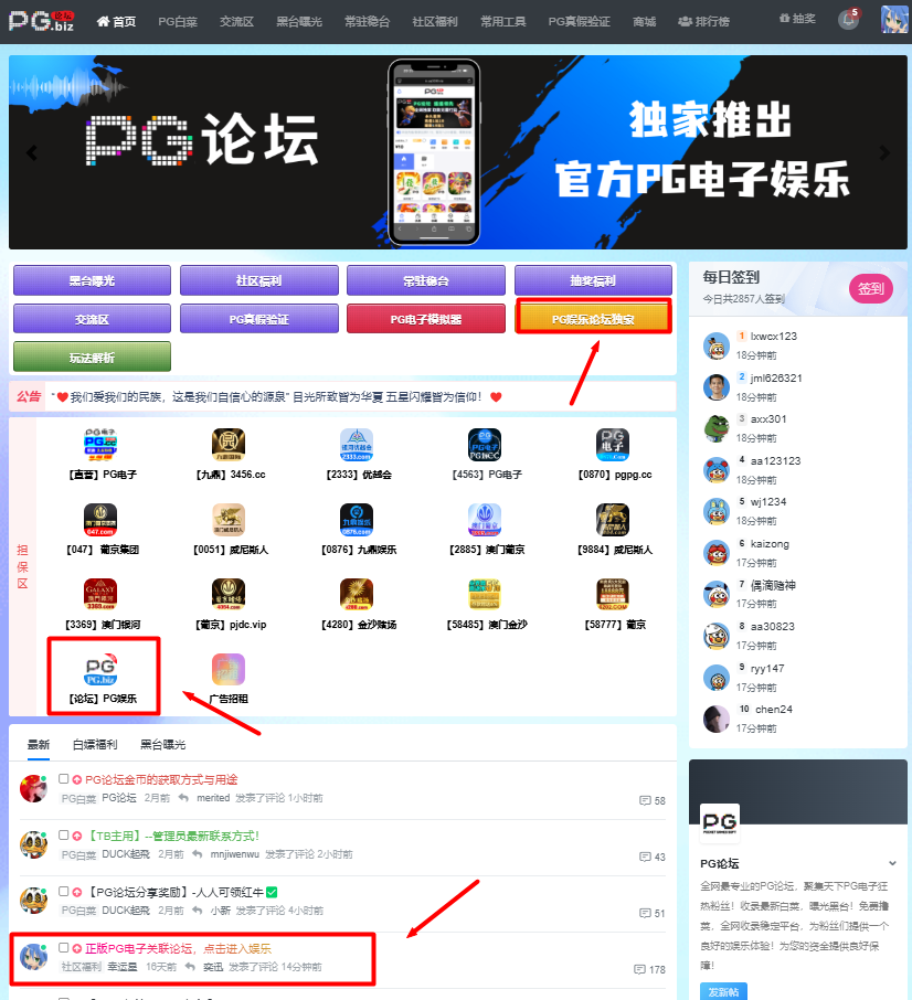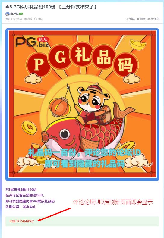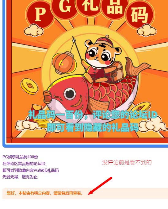关于PG娱乐礼品码的问题,群里还是有个别的老哥不知道是怎么领取的,这里我再跟大家详细解释一下。首先,你得有个PG论坛账号,并且已经关联PG娱乐。以下是PG娱乐的进入方式。这三个红色箭头所指的地方都是可以进入PG娱乐的,进去之后就会自动关联并进入PG娱乐。只需要每日签到即可获得10金币,然后在PG娱乐免费娱乐,只要打上去200以上,即可提款。提款比例为10:1,无打码要求,不像那些狗庄会罚你流水什么的,我们不会,算是PG论坛给大家的一个小小福利。丑话说在前头,这个福利是给真正热爱PG论坛的会员们的,但是如果有人不把我们当人,恶意注册一堆账号来套利,查到多ip多账号等恶劣玩家,PG论坛会直接封禁账号,不予以出款。咱们做的是白菜论坛,非常懂辨别恶意套利玩家。有点离题了,现在回到主题。除了免费玩PG娱乐之外,咱们时不时会在论坛发PG娱乐的礼品码给大家兑换,算是一点小福利,每次发帖前我们会在TB Talkblink群里面通知,让大家准备去领,所以有在咱们TB群里的小伙伴是有点优势的,谁支持我们PG论坛呢就宠谁。以下是TB群的管理联系方式与下载方式。TB聊天软件:talkblink.app注册服务器ID:65886 北极星TB:20256666 【处理PG娱乐问题】TB Talkblink下载网址TB Talkblink下载网址2在群里通知发帖的时间后,版主即会在约定的时间论坛置顶出发帖,获得礼品码的方式很简单,只需要在帖子底下留言您的论坛UID,然后刷新页面,即可看到隐藏内容。看到发帖时在评论区留言后,刷新页面即可看到隐藏内容,如下图注: 有个别极品会员说此礼包码是假的,兑换的时候显示被人领取完了在这我想跟大家说,这个礼包码大家看到的都是一样的,只是有设置了领取人数,例如我设置当日100份,被100人兑换了就没有了,类似支付宝或者微信红包的拼手气红包,领完了就没有了,所以不要再说咱家给的礼品码是假的了,PG论坛的实力,送这么点福利还是有的。礼品码兑换方式 :从论坛进去PG娱乐,然后如下图以上就是礼品码的兑换方式最后结尾,最近有个别老哥跟我们反馈邀请了朋友来注册,但是论坛账号里面没有自动获得10金币,这一点版主已经向技术反馈了,让他抓紧查看是哪里出现Bug了,请给版主一点时间,带来的不便请多多包涵。谢谢大家!! PG论坛版主 幸运星