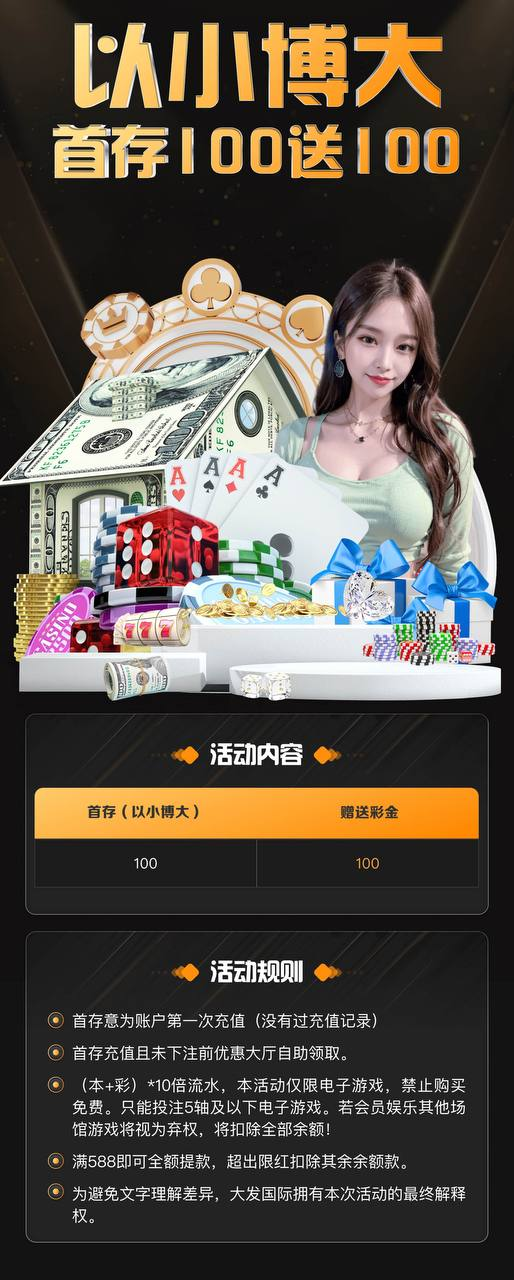 ⚜大发国际⚜️ 点击注册大发国际以小博大 首存100送100充值后先别下注,先前往优惠大厅自助领取10倍流水可提现,只能娱乐5轴以下的电子游戏,不能买免费,满588可全额提款超出限红扣除其余余额点击注册大发国际