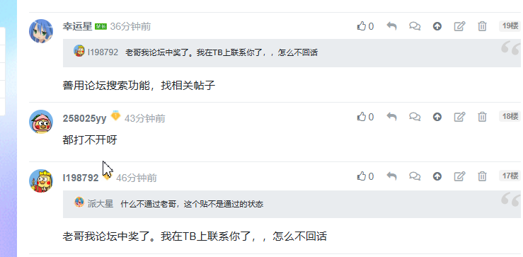 l198792 扯淡的,,论坛中奖了,联系管理人员。他们爱搭不理的,,也不说话。。有什么用