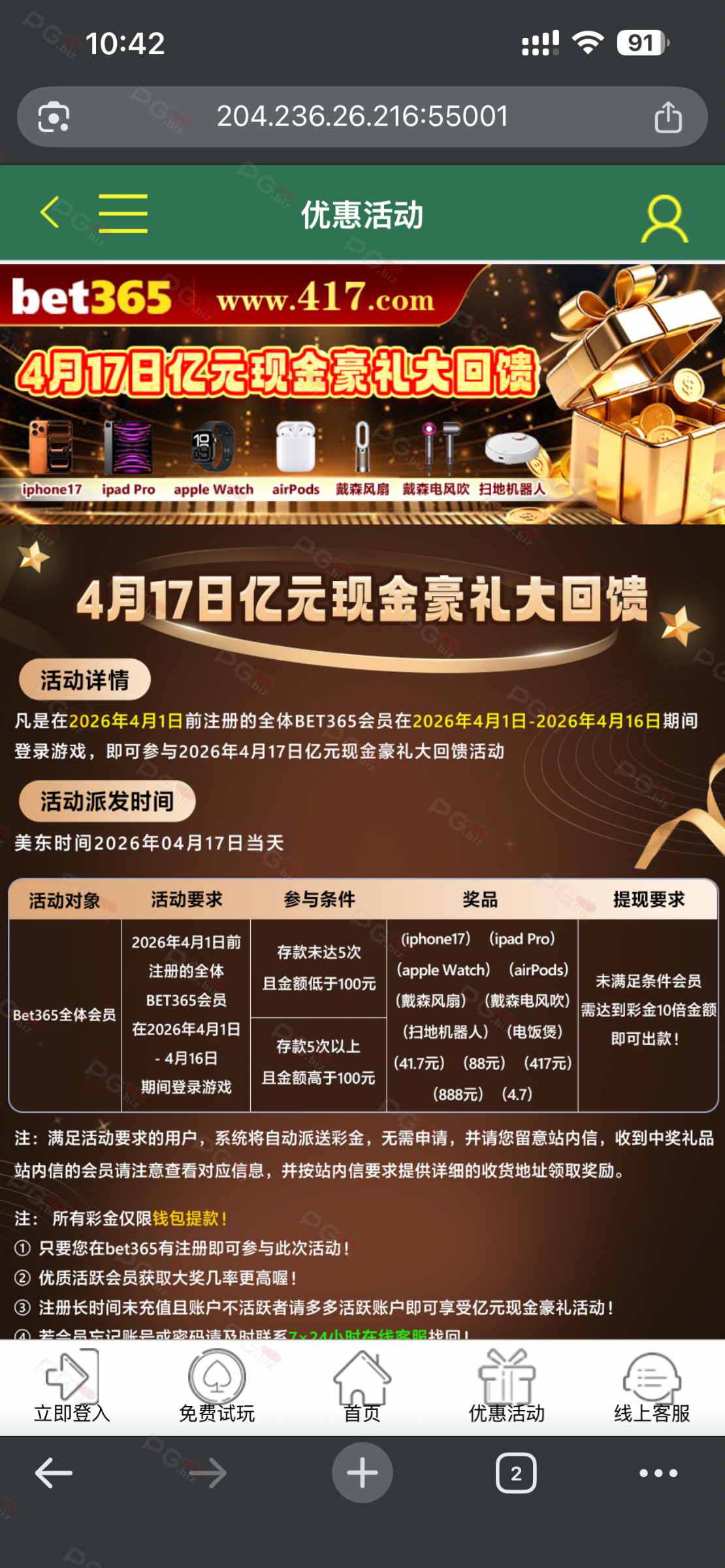 一年一次的回馈来了,4月1日前注册的,4月1号到16号登录,明天4月17记得上线领取领取网址,417.com