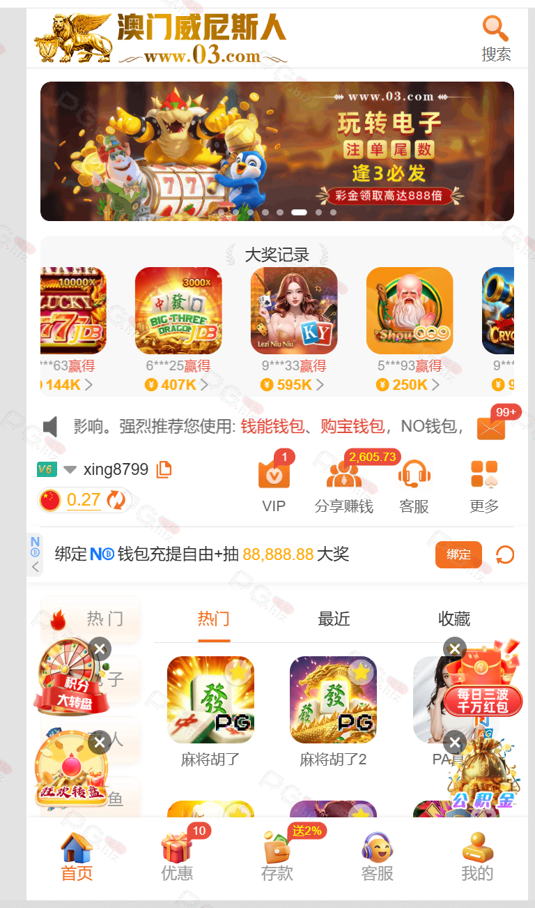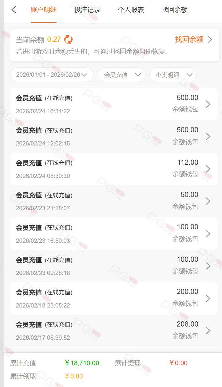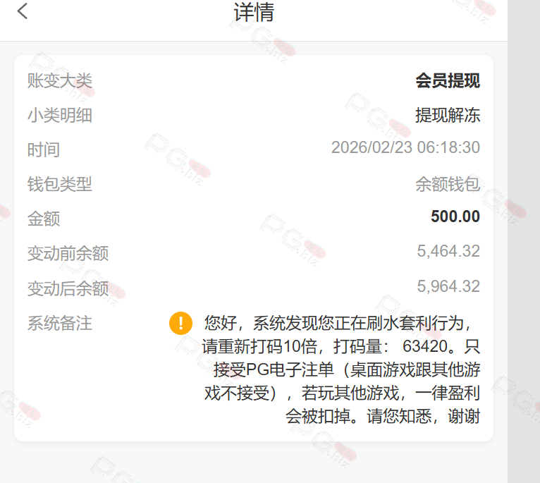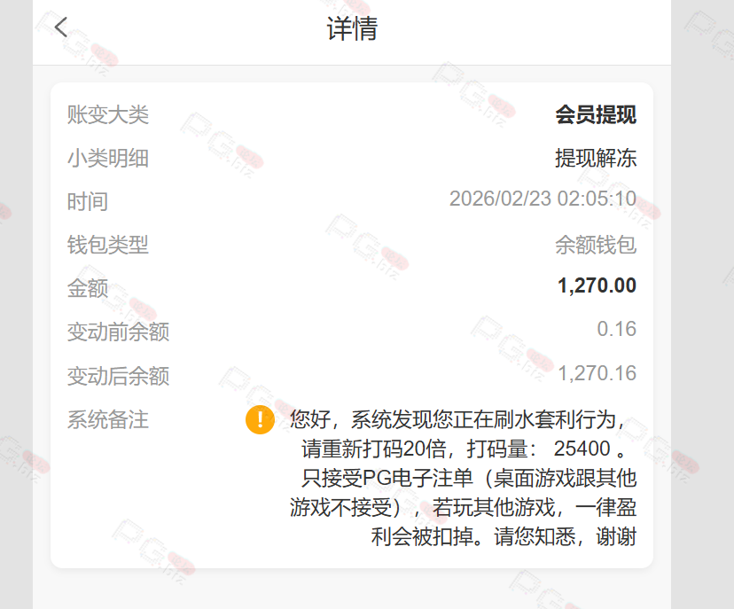 2月24号领了888提1270让打20倍PG流水,当时我就当黑了,主要是这逼台子我PG就没赢过,去PG买免费玩儿,结果那天估计PG刚好放水,流水打完居然6000多了,然后提款又加10倍PG流水,我就知道不可能提得出来了,输到剩最后128流水都没打够我提了一下结果秒到。然后封了我所有的优惠,包括反水佣金那些,连充值都一分钱不送。理由是我账号多彩金,我真他妈无语,你做不起活动就不要送啊,后面又说我账号不活跃,我他妈每个月充值在一个左右,隔两三天就有充值也能不活跃。12月份有一次提3000多也被加了10倍PG流水,后面就输完了。现在我账号的佣金加反水各种优惠就有五六千全部封着。