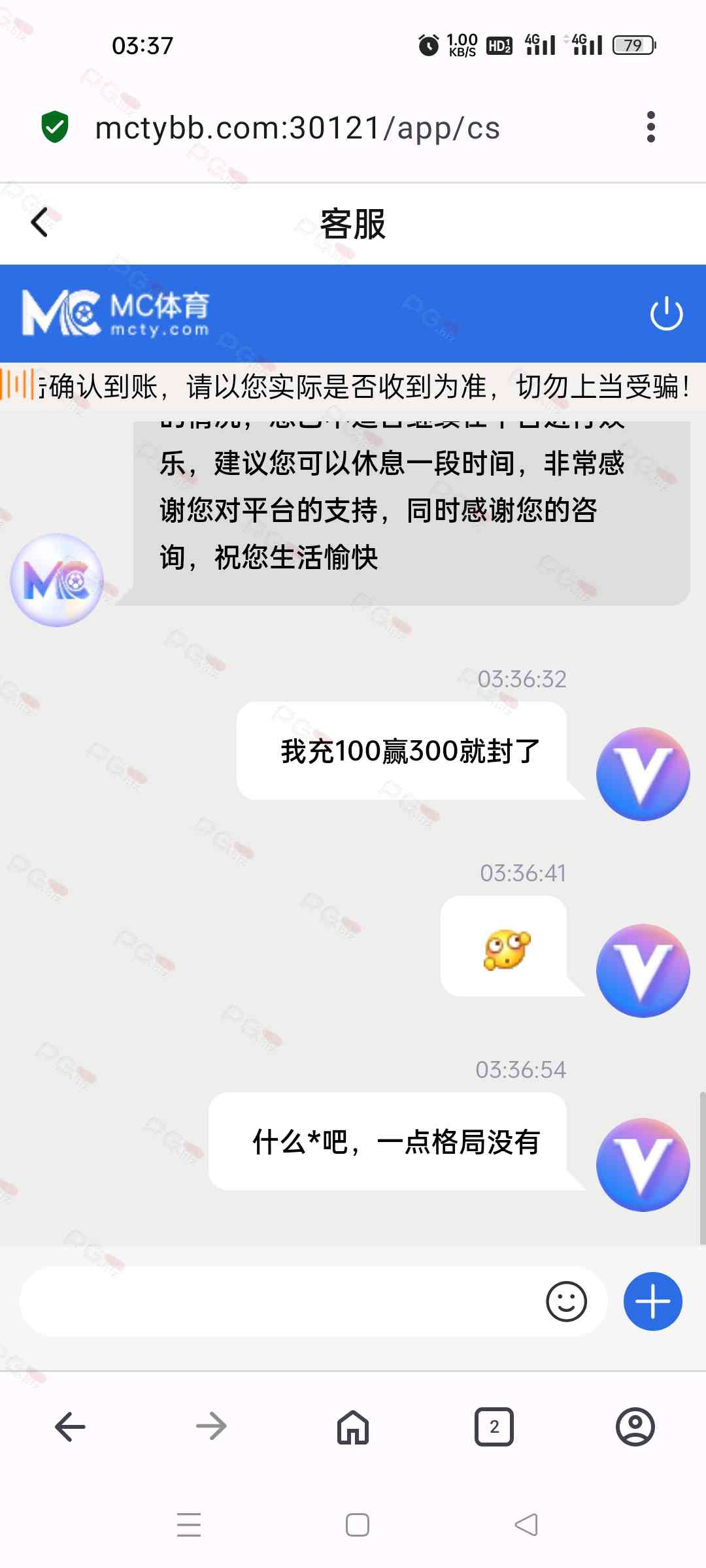 mc体育充值100赢300就提现封号了,说我违规下注违不违规我自己还不知道,穷的只剩一部手机又没对刷结果就给我封了,本来刚开始是电话邀请送了我108元的我一把梭哈就输光了,然后看他嗯是首存100送38我才充的,然后玩真人赢了300提现200就给我封了