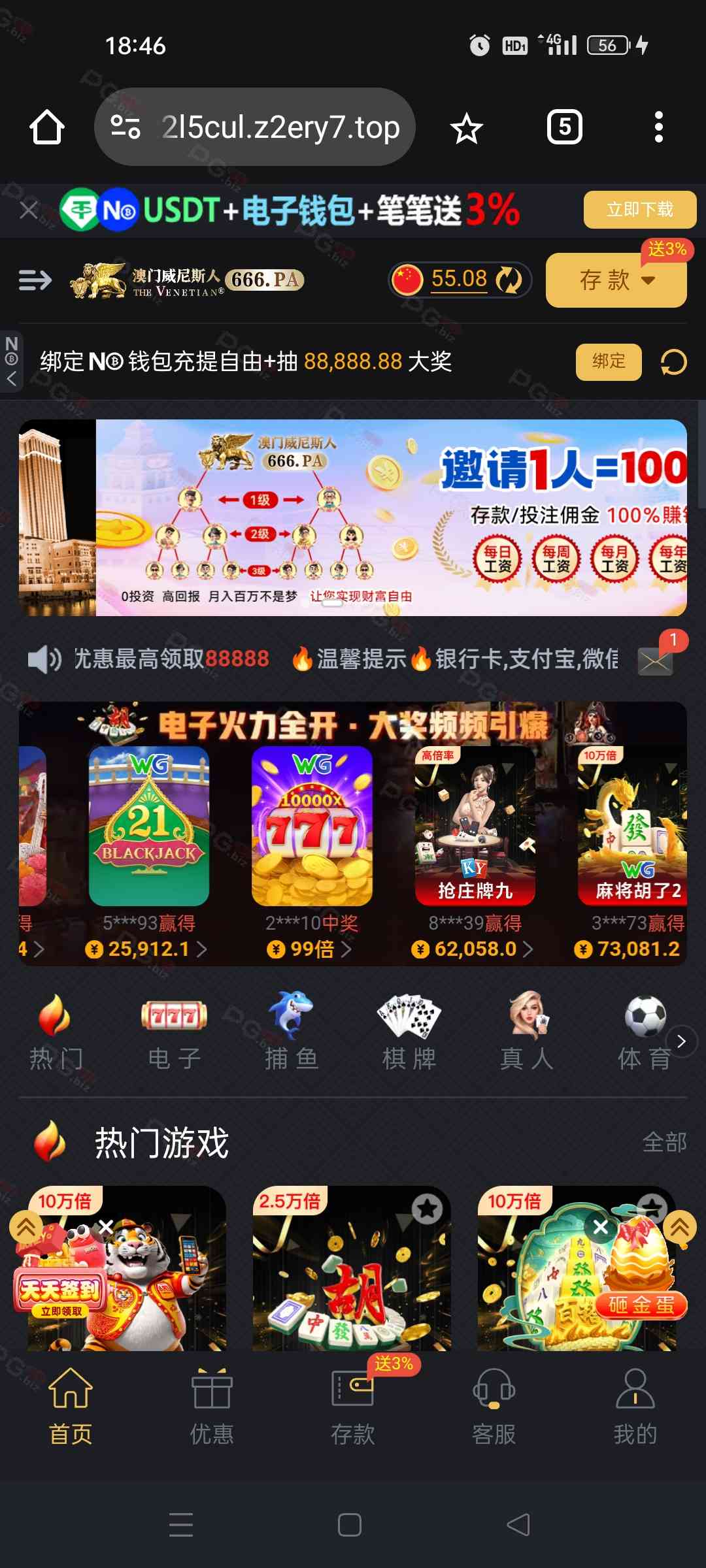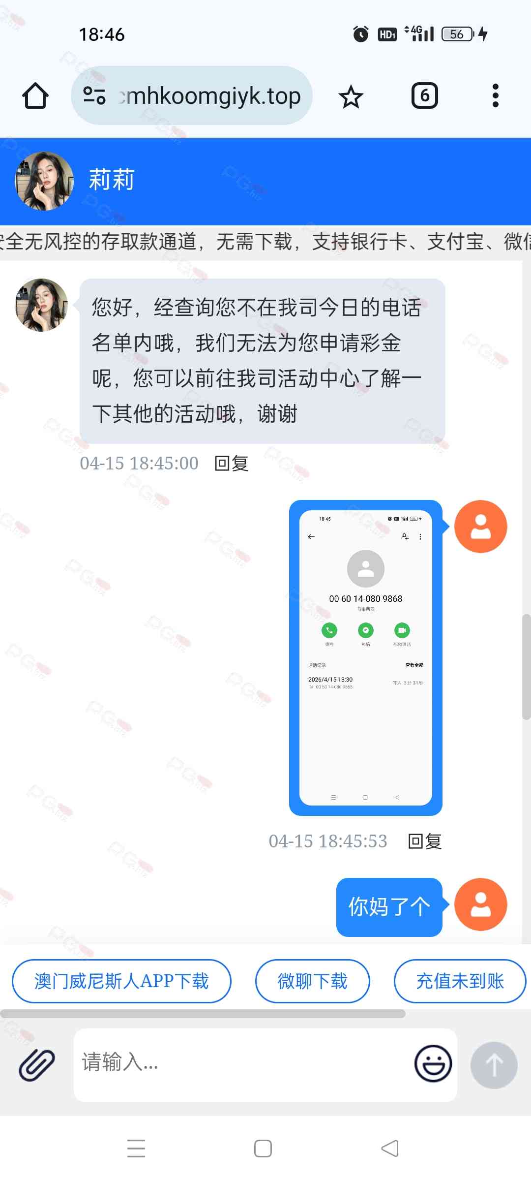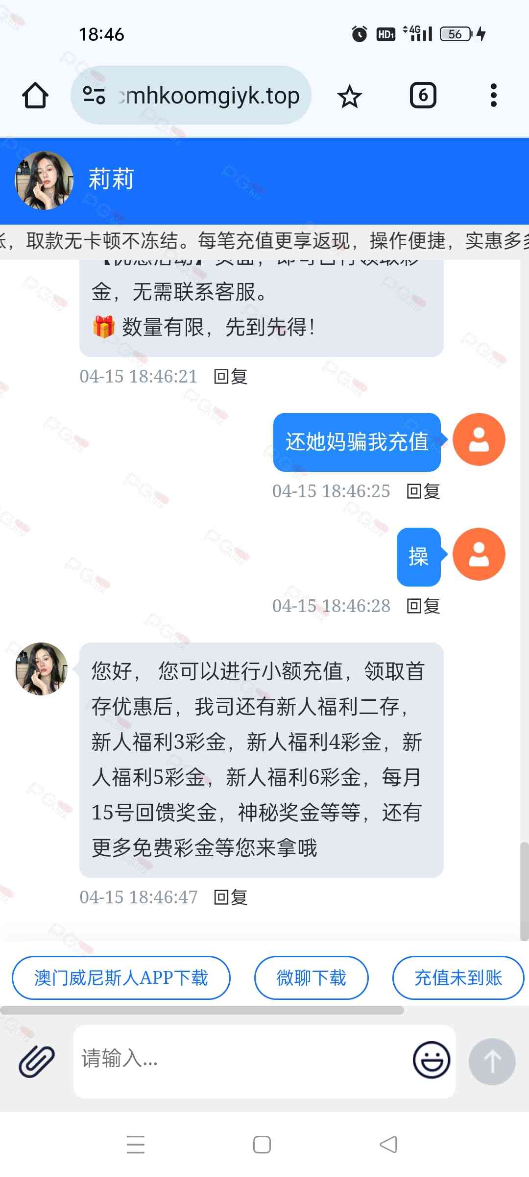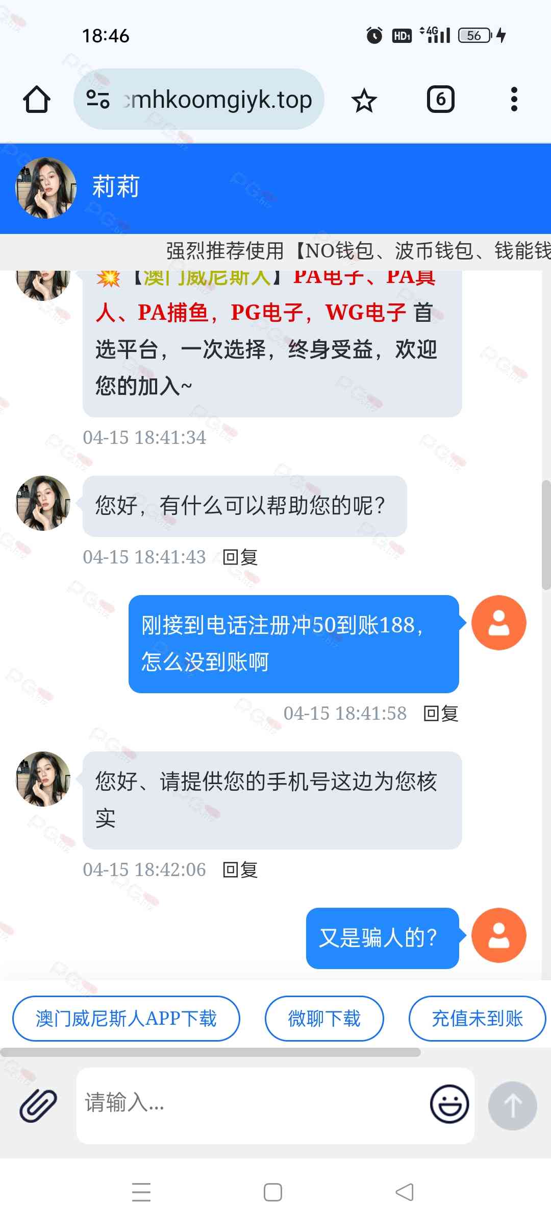 打电话给我说注册充50送50,再加赠88,一共到账188,一杯水。我注册充了50,他说5分钟自动到账,然后电话挂了,半个小时没到账,去找客服,客服说没有,踏马的狗东西666.pa